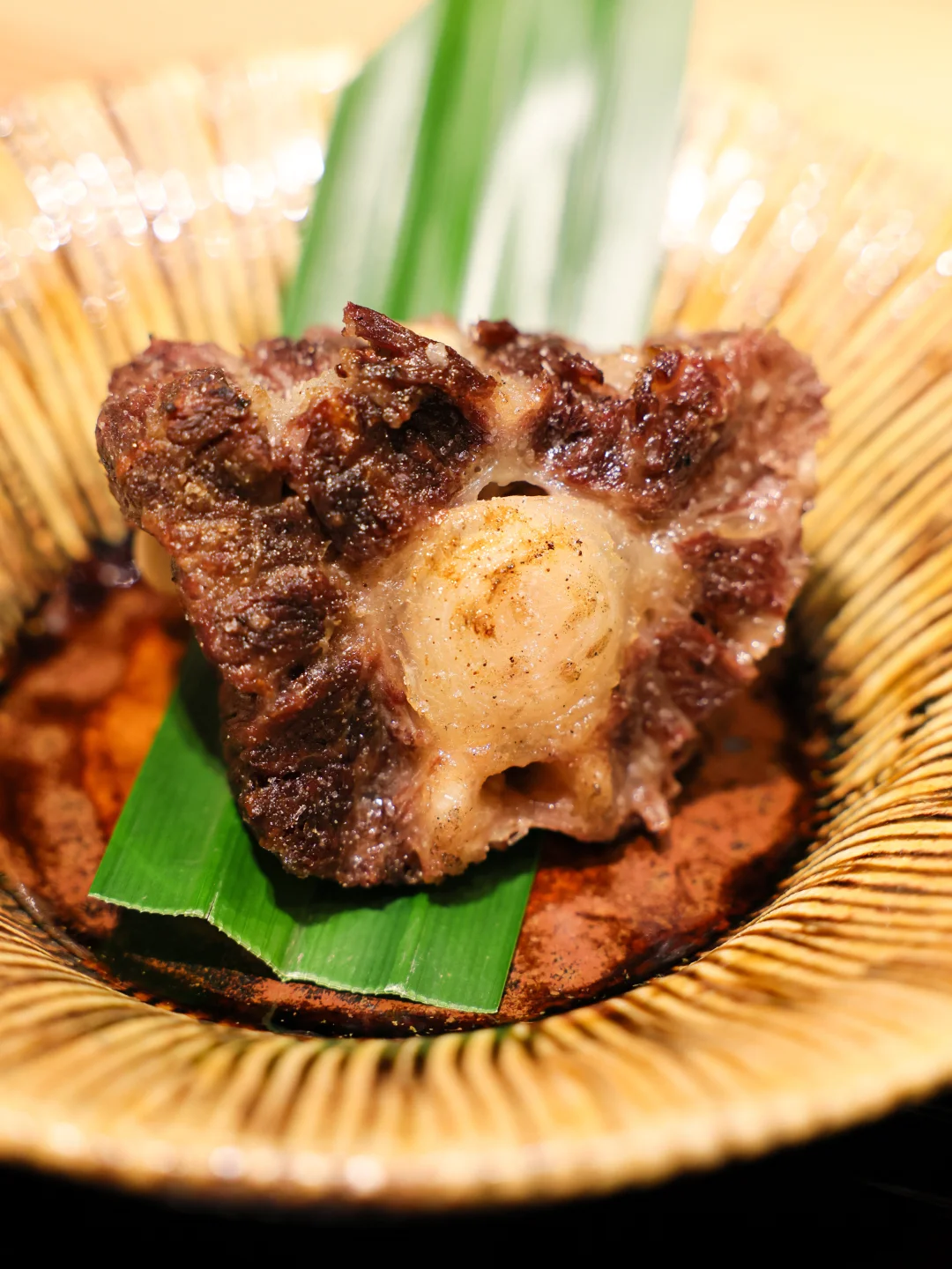 这个真的是很好吃,已经夸了四次了:牛尾上的牛肉丝根根吸收了盐烤的风味,咬紧嘴里还能感受到肌肉纤维之间的张力;而肉丝之下,是埋在与骨头之间满满的胶原蛋白。