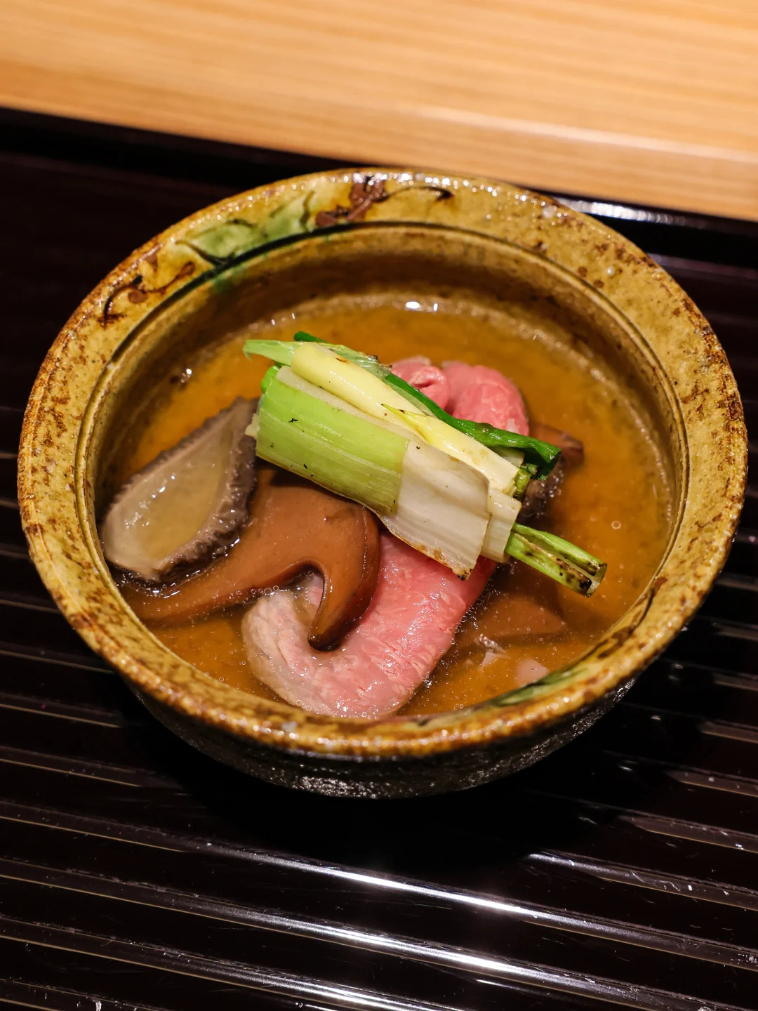 而且寿喜烧没有搭配生鸡蛋液,我居然能更清晰的感受到肉的油脂香气!加上顶部炭烤过的九条葱,香气更上一层 这个是这次新菜最好吃的。