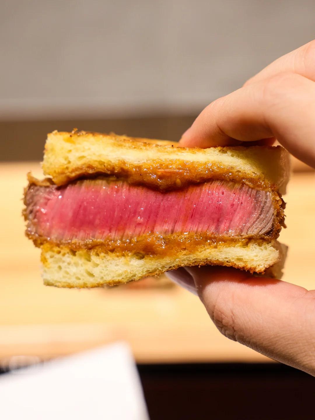 这道菜让我最佩服的是,三明治、肉中间的面衣和肉三者是一体的,炸过的脆壳怎么做到不硌嘴的!牛肉入口即化,香得离谱。