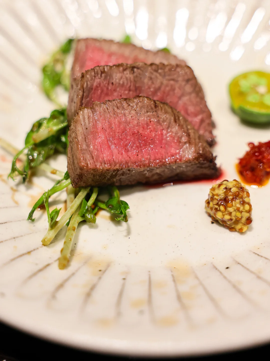 下一道是烤的三片菲力肉,外皮微微焦,五成熟的处理几乎也是入口即化;一定要试试搭配的这个辣椒酱,非常香辣,却不会抢味,能让油脂香气更加外放。