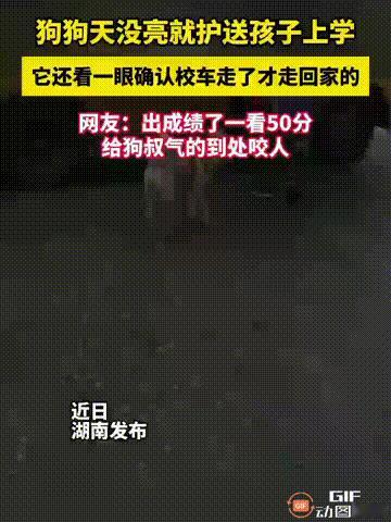 太有灵性了!湖南一名女子发视频称,自己家的小狗,每天早上都坚持送孩子上学,直到亲眼看到孩子坐上校车,小狗才会放心地离开,而离开一段距离后,又会不舍地回头看一眼,然后再往家里走去。 对此女子表示,“小狗很懂事,一直陪着孩子,它的忠诚和陪伴,确实很让人感动。” 网友看完这段视频,都觉得这只小狗的举动,实在是太让人感到泪目了。 万物皆有灵,而这只小狗不仅有灵性,也多了一份责任感,它每天都在天不亮的时候,陪着孩子走到指定地点等校车,直到看着孩子坐上校车,它才会转身离开。 更让人感动的是,之后它还会回头看一眼,确定校车离开了,它才会往家里走。 这份细腻的心思,简直就和为人父母的感觉一模一样,可见它是真的疼爱孩子,已经把孩子当成自己的宝贝,一定要护着他的安全,不得不说,有这么一只小狗在家里,真的给主人省去了很多忧愁,实在是太让人动容了。大家怎么看呢?