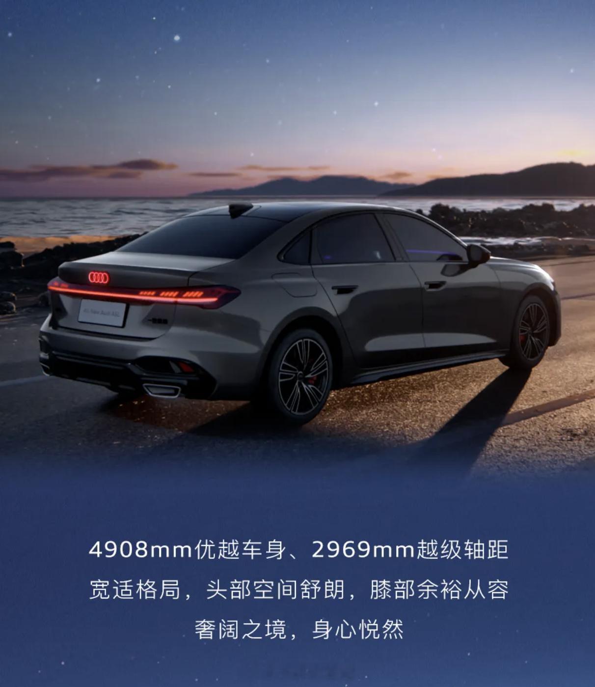 据悉,新车增加了前 / 后红色刹车卡钳、银河星空顶、19 英寸 5 辐锋翼双色轮圈、黑色织物顶棚、前排座椅通风等配置。该车采用奥迪最新的 E³ 1.2 电子电气架构,凭借高算力、高扩展性及灵活的迭代能力,为深度接入组合驾驶辅助提供底层支撑。同时,奥迪全新 PPC 豪华燃油智能平台采用第五代 EA888 发动机,拥有 150kW 峰值功率。该车轴距较海外版 A5 Limousine 加长 77mm 至 2969mm,车长达到 4908mm,尺寸接近欧洲标准轴距 C 级车