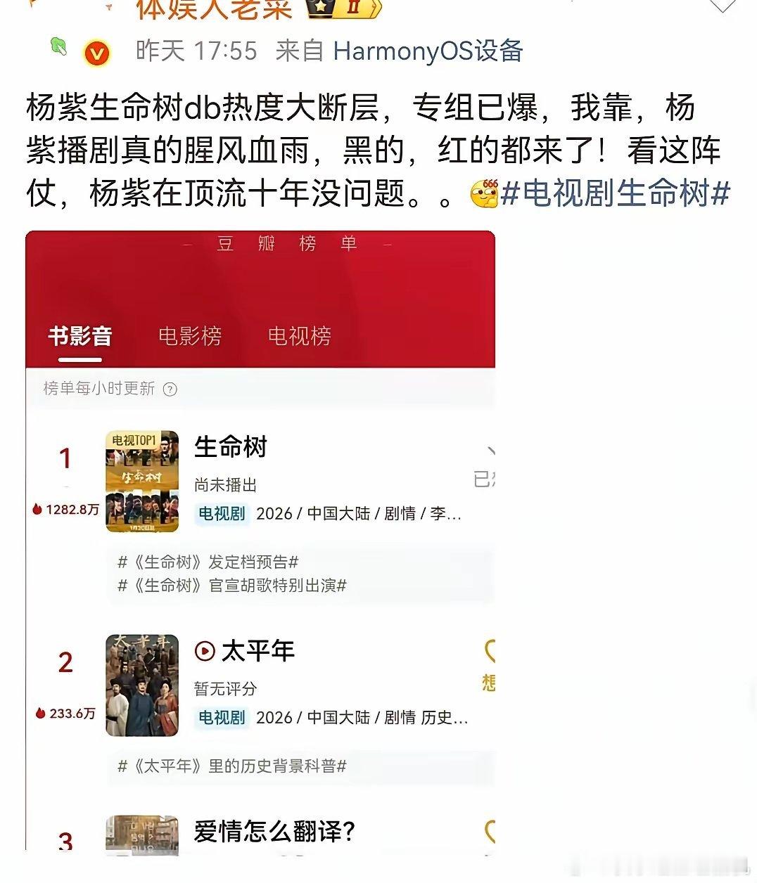 央视今晚这步棋,走得太险了。把杨紫、胡歌这两个“王炸”扔进可可西里,拍一部几乎没有商业爽感的现实题材剧《生命树》。没有流量密码,只有风沙、孤寂和随时可能响起的枪声。别指望看到什么神仙打架、情爱纠葛。这剧的底色,是巡山队员用命换回的藏羚羊迁徙线,是高原上稀薄空气里每一次搏命的呼吸。你看到的将不再是明星,而是人在极端环境下,如何被撕开、被碾碎,再重新拼凑起一个叫“信念”的东西。我知道,很多人等着看杨紫的转型之战。她脱下古偶的华服,换上一身尘土,演的不是大女主,而是那个叫白菊的,会哭会怕、但枪口永远对准盗猎者的普通女警。这剧赌的不是收视率,而是我们这个时代还缺不缺仰望星空的人。
