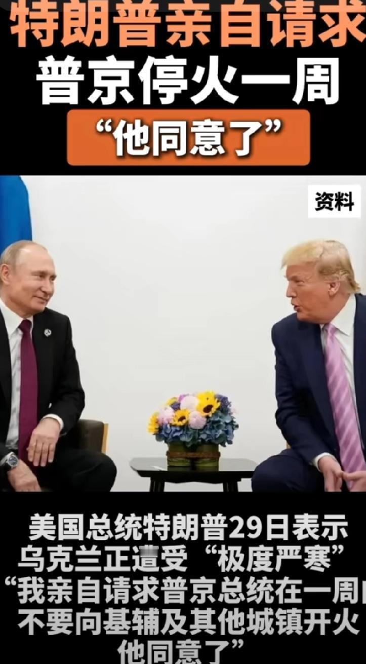 特朗普建议普京停止一周攻打基辅及其乡镇地区,理由是乌克兰迎来极寒天。上面的消息是