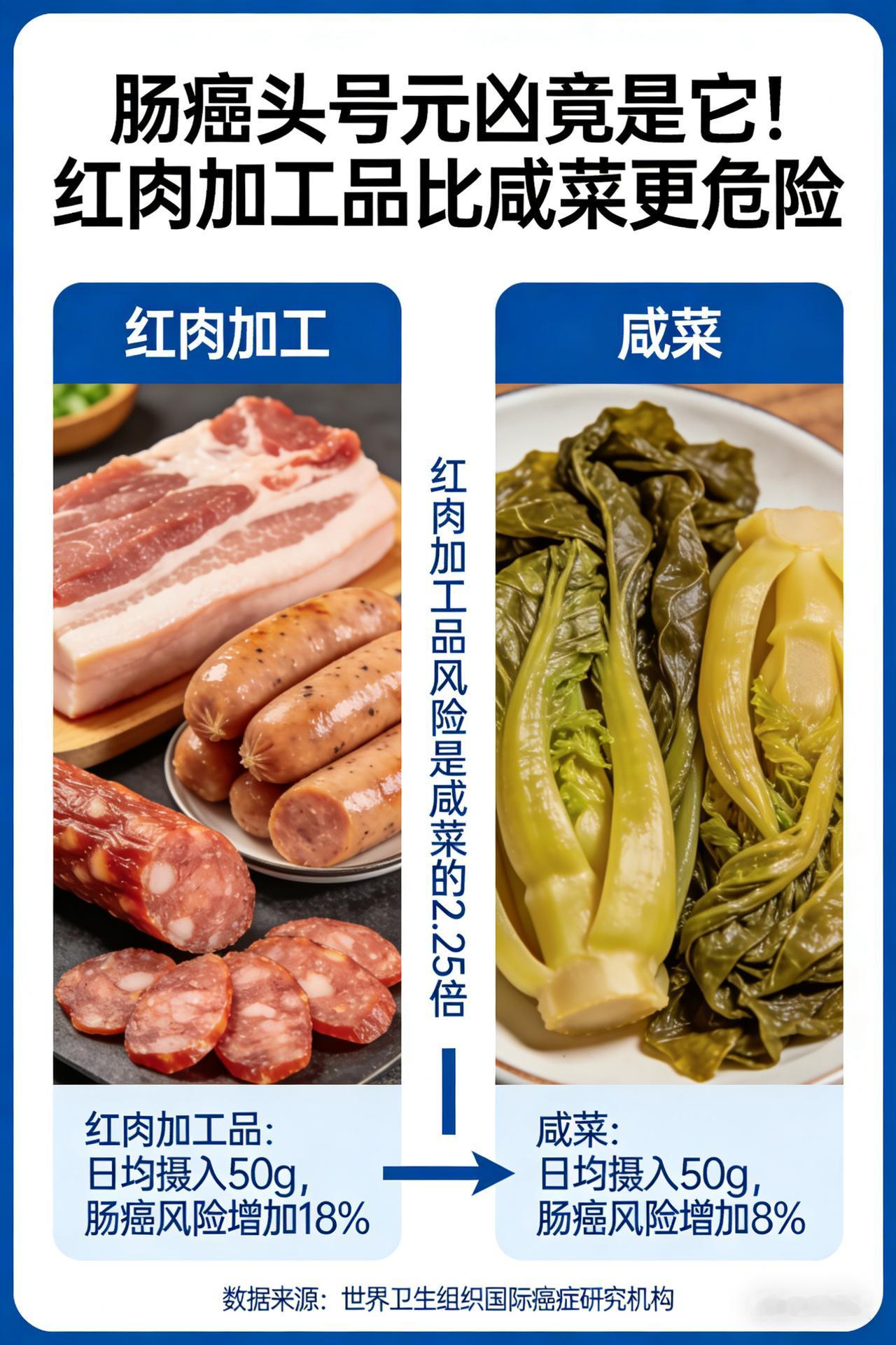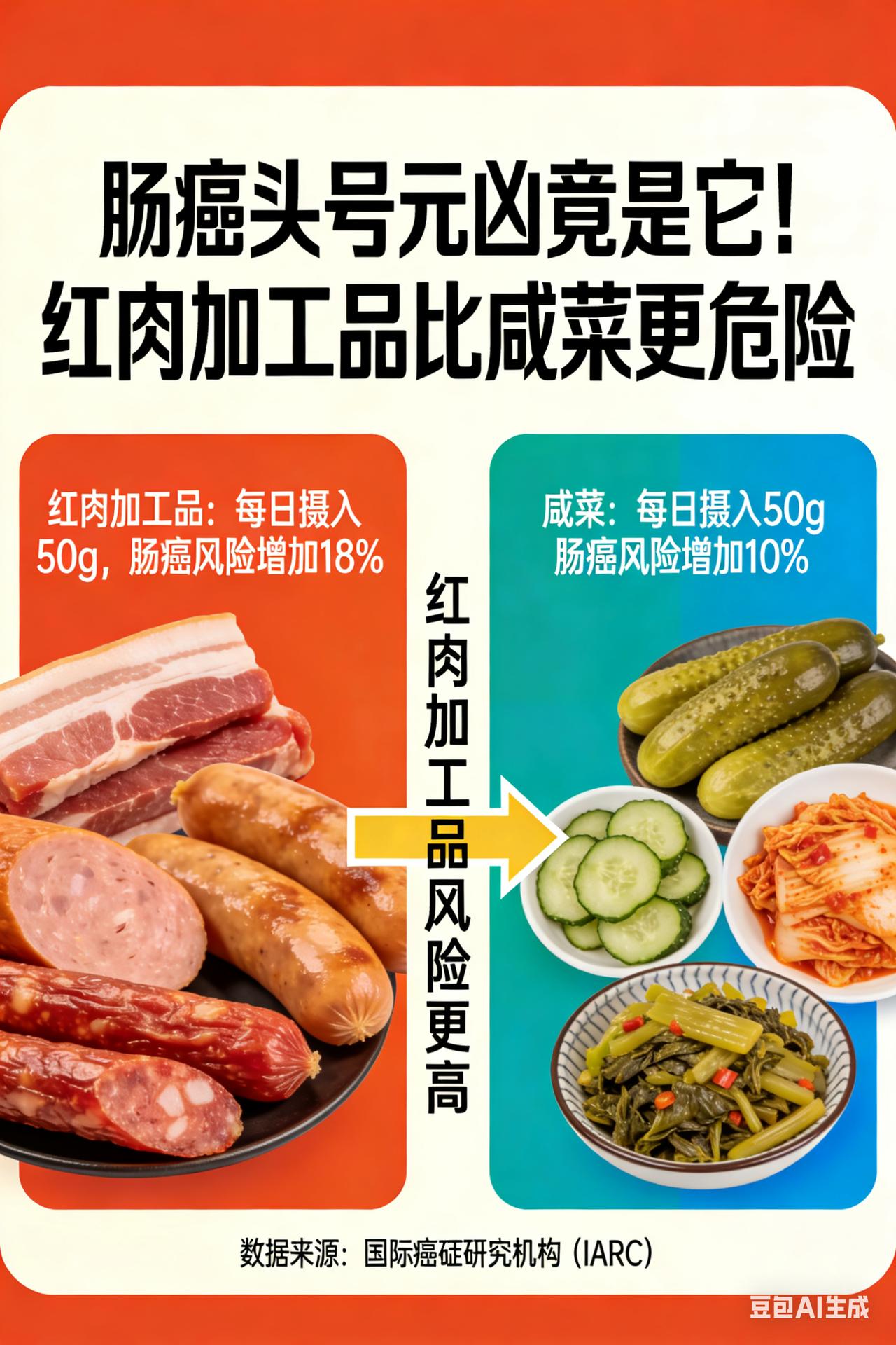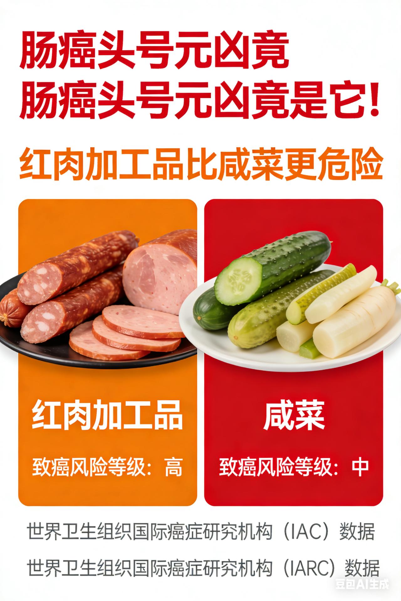 肠癌头号元凶竟是它!红肉加工品比咸菜更危险 大肠癌“元凶”大揭秘!咸菜竟未上榜,第1名你天天都在吃? 在健康威胁的“黑名单”上,大肠癌宛如一个隐匿而凶狠的“杀手”,作为消化系统里极为常见的恶性肿瘤,它悄无声息地侵蚀着人们的健康。而你知道吗?其发病“源头”错综复杂,饮食因素更是首当其冲。令人大跌眼镜的是,传统观念里常被视为“嫌疑重犯”的咸菜,此次竟未上榜“头号元凶”,反而是有一种食物,或许天天都出现在你的餐桌上,却悄然埋下了健康的“定时炸弹”。 高脂低纤维饮食:肠道的“噩梦开端” 想象一下,你的肠道就像一条繁忙而有序的“交通要道”,而长期高脂、低纤维的饮食模式,就像是一场突如其来的“交通大堵塞”。动物脂肪的大量涌入,如同疯狂涌入的重型卡车,刺激胆汁分泌异常增多。肠道内的厌氧菌则像一群贪婪的“分解者”,趁机将胆汁酸分解,产生出致癌物质甲基胆蒽,如同在肠道里埋下了一颗颗“毒瘤种子”。与此同时,膳食纤维的严重匮乏,让肠道蠕动变得迟缓不堪,粪便在肠道内停滞不前,就像堵在路上的车辆,使得致癌物与肠黏膜的接触时间大幅延长,肠黏膜细胞在这场“毒物侵袭”中,异常增生的风险急剧上升。而红肉和加工肉制品中的亚硝酸盐、多环芳烃等有害物质,更是像一群“帮凶”,进一步诱发肠上皮细胞发生恶性变化。 加工肉制品:餐桌上的“致命诱惑” 腊肉、香肠等加工肉制品,宛如餐桌上的“甜蜜陷阱”,散发着诱人的香气,让人难以抗拒。然而,在它们美味的背后,却隐藏着巨大的危机。在制作过程中,常常会添加亚硝酸盐,这些亚硝酸盐进入肠道后,就像被施了魔法的“变身精灵”,迅速转化为亚硝胺类致癌物。长期大量摄入这类食品,肠上皮细胞的DNA甲基化就会出现异常,如同电脑程序出现了错误代码,显著提升了癌变的可能性,让你的肠道一步步走向危险的边缘。 酒精:损伤黏膜的“隐形刺客” 乙醇,这个看似普通的化学物质,在进入人体后,却摇身一变成为了损伤黏膜的“隐形刺客”。它代谢后产生的乙醛,就像一把锋利的“暗器”,直接对肠黏膜屏障功能造成严重损伤。而且,它还会抑制叶酸的吸收,导致DNA合成出现障碍,就像建筑工地的材料供应中断,让肠道细胞的修复和再生变得困难重重。长期饮酒的人,常常会出现腹泻、贫血等症状,肠镜下观察能看到黏膜充血糜烂,这无疑是“刺客”留下的“罪证”,为肿瘤的发生创造了绝佳的条件。 遗传因素:不可抗拒的“命运枷锁” 大约10%—15%的大肠癌患者,仿佛被命运套上了无形的“枷锁”,存在家族遗传背景。一级亲属中有大肠癌病史的人群,就像被贴上了“高危标签”,其患病风险会显著增加。像遗传性非息肉病性结直肠癌和家族性腺瘤性息肉病等遗传性疾病,更是如同基因里的“定时炸弹”,直接导致肠道黏膜细胞异常增殖,让患者在不知不觉中陷入健康的危机。 预防大肠癌,是一场刻不容缓的“健康保卫战”。我们必须从源头抓起,合理调整饮食结构,增加膳食纤维摄入,减少高脂、加工肉制品和酒精的摄入,同时定期进行肠道健康检查,做到早发现、早干预,才能在这场战争中守护好自己的健康防线。