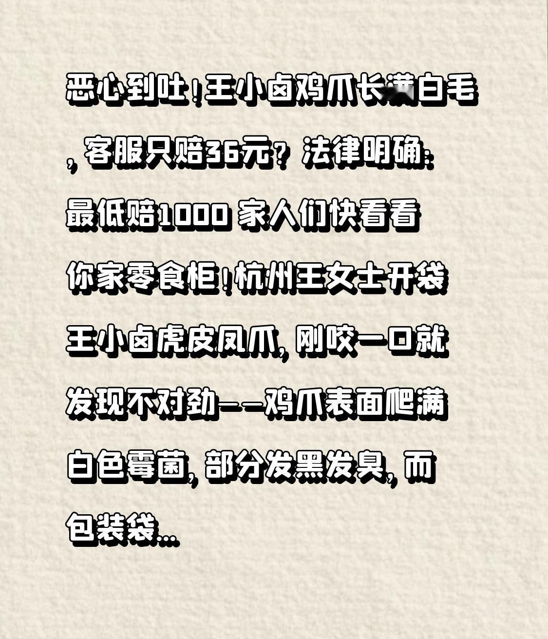 恶心到吐!王小卤鸡爪长满白毛,客服只赔36元?法律明确:最低赔1000 家人们快看看你家零食柜!杭州王女士开袋王小卤虎皮凤爪,刚咬一口就发现不对劲——鸡爪表面爬满白色霉菌,部分发黑发臭,而包装袋完好无损,还在9个月保质期内😭 更气人的是,客服一句“运输磨损”就想甩锅,只愿赔36元,可法律早就明确规定:这种情况最低赔1000元! 这事可不是个例!最近王小卤鸡爪被曝发霉变质冲上热搜,740万网友围观吐槽。黑猫投诉平台上,浙江、重庆、山东等地消费者密集投诉:有人吃出发酸变质的鸡爪,拉肚子跑了三趟医院;有人在鸡爪里吃出头发,客服装傻充愣不处理;还有人刚拆封就看到黑毛霉菌,吓得直接扔了整箱。要知道王小卤可是单价13元的中高端零食,号称“高温炸制+真空锁鲜”,怎么还能在保质期内集体发霉? 但关键转折来了!面对全网质疑,品牌客服的回应堪称“教科书式甩锅”:先是一口咬定“生产环节没问题,大概率是运输或存储磨损导致”,可多位消费者晒出完整包装照片,根本没有破损痕迹,这说法显然站不住脚。更离谱的是赔偿方案,初期只愿按单包十倍赔36元,杭州王女士拒绝后,品牌迫于舆情才升级到500元赔付,而其他投诉者至今还在被敷衍,有人维权半个月仍没拿到合理赔偿。 其实这里藏着一个关键真相:王小卤采用代工模式,合作了江苏、天津、安徽等5家代工厂,却没建立完善的品控体系。虽然品牌有自己的企业标准,要求符合国家食品安全规范,但高温炸制工艺只能抑制部分细菌,一旦原料污染、设备清洁不到位,或者封装密封性抽检遗漏,霉菌就可能在真空袋里滋生。更讽刺的是,早在2024年就有消费者投诉类似问题,可品牌没整改,才导致2025年底到2026年初集中爆发霉变事件。 所有消费者都该记住:根据《食品安全法》第148条,生产不符合安全标准的食品,消费者可要求价款十倍或损失三倍赔偿,不足1000元按1000元算,根本不用证明身体受伤!潮州法院就曾判决过类似案例,消费者花37元买的发霉零食,最终获赔1000元。遇到这种事,别被商家的“低额赔偿”忽悠,按这3步维权:第一,拍视频固定证据(包装完好性、保质期、霉变特写,拆封过程要连续录制);第二,保存购物凭证和客服沟通记录;第三,协商无果直接找12315投诉,或向法院起诉。 网红零食不能只靠营销讲故事,食品安全才是底线。我们愿意为品牌溢价买单,买的是放心和品质,而不是保质期内的“发霉盲盒”。王小卤的500元赔付看似让步,却没公开整改措施,也没覆盖所有受害者,这种“头痛医头”的处理方式,只会让消费者寒心。 你有没有遇到过食品发霉的情况?是自认倒霉还是坚决维权?评论区聊聊你的经历,关注我,下期分享网购食品维权的完整证据链攻略,让你不吃哑巴亏!