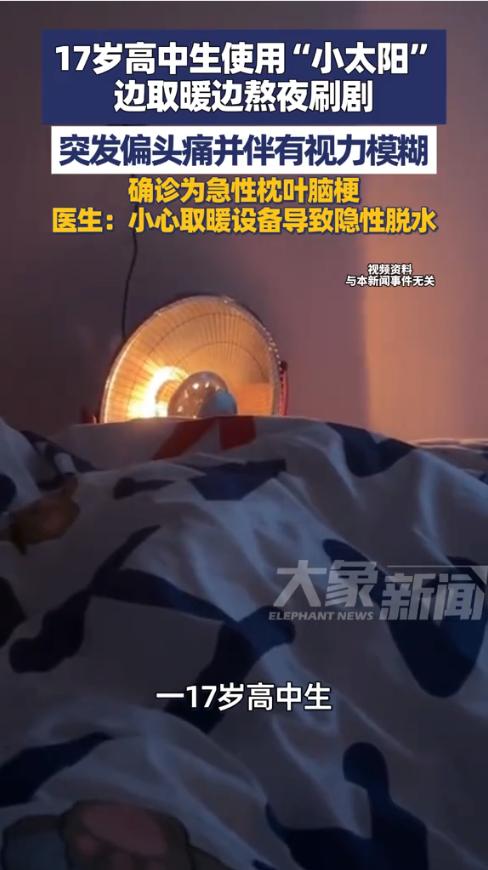 “悲剧还是发生了!”1月29日,福建,一17岁高中生为了暖和点熬夜刷剧,把小太阳放在身边烤了好几个小时,结果突然开始头痛欲裂,看东西一片模糊,家人赶紧送医,最终诊断为急性枕叶脑梗。网友:烤小太阳怎么就能引发急性脑梗呢? 进入冬季后,天气寒冷,尤其男方家庭由于没有暖气都很难受,为了暖和点,都会配点取暖设备,像小太阳和暖风机一类的就很常见。但是这种设备根本不适合长时间使用。 据媒体报道,这名高中生为了熬夜刷剧不冷,就将家里的“小太阳”放在身边取暖,就这样一边看剧一边取暖,很是惬意,就连下地喝水都不想动,一直忍着。 起初他只是觉得头皮发麻、眼睛干涩,以为是突然烤火的正常现象,适应一下就好了,但没过多久就开始剧烈头痛,看东西也变得模糊不清。家人发现情况不对后,立即将他送往医院。 医生检查后确诊为急性枕叶脑梗,罪魁祸首正是“小太阳”导致的隐性脱水,原来长时间近距离使用取暖设备,身体会在不知不觉中流失大量水分,血液黏稠度升高,进而引发血栓堵塞脑血管。若再晚送医一步,可能会造成永久性视力损伤甚至危及生命。 医生提醒,使用取暖设备时,一定要保持室内通风,每小时补充一次水分,避免长时间近距离直吹,防止“隐形脱水”引发的健康危机! 信息来源:《1月29日(报道)福建,17岁高中生使用“小太阳”,边取暖边熬夜刷剧,突发偏头痛并伴有视力模糊,确诊为急性枕叶脑梗,医生:小心取暖设备导致隐性脱水》大象新闻