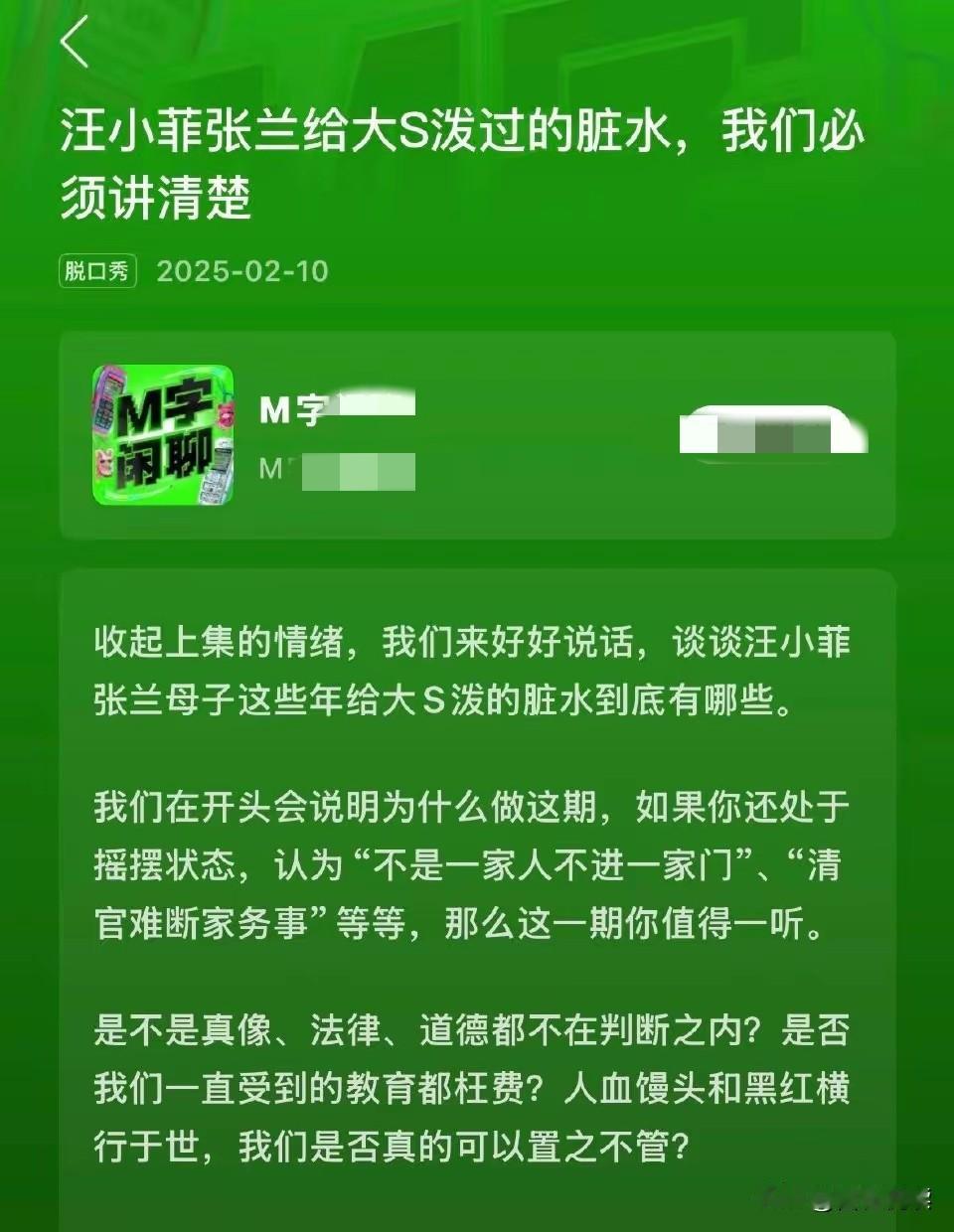 大家发现了吗 汪徐两家的恩恩怨怨 是是非非早已不是家事 随着当年大S的闪离又闪婚 前婆家母子两人的相继网络开撕 大S的情感生活就陷入了崩盘 在跟光头苦苦支撑了三年后 终以她的香消玉殒告一段落 可惜的是树欲静而风不止 汪家已绝口不再提孩子亲妈 徐家也看似慢慢在放下 奈何有些媒体不行 据说出了个M闲聊 要给大S正名 大小S的好友蔡康永看到了 还把详情转给了小S看 话说马上就到大S周年忌日 这个网络江湖会不会 再次掀起一场腥风xue雨