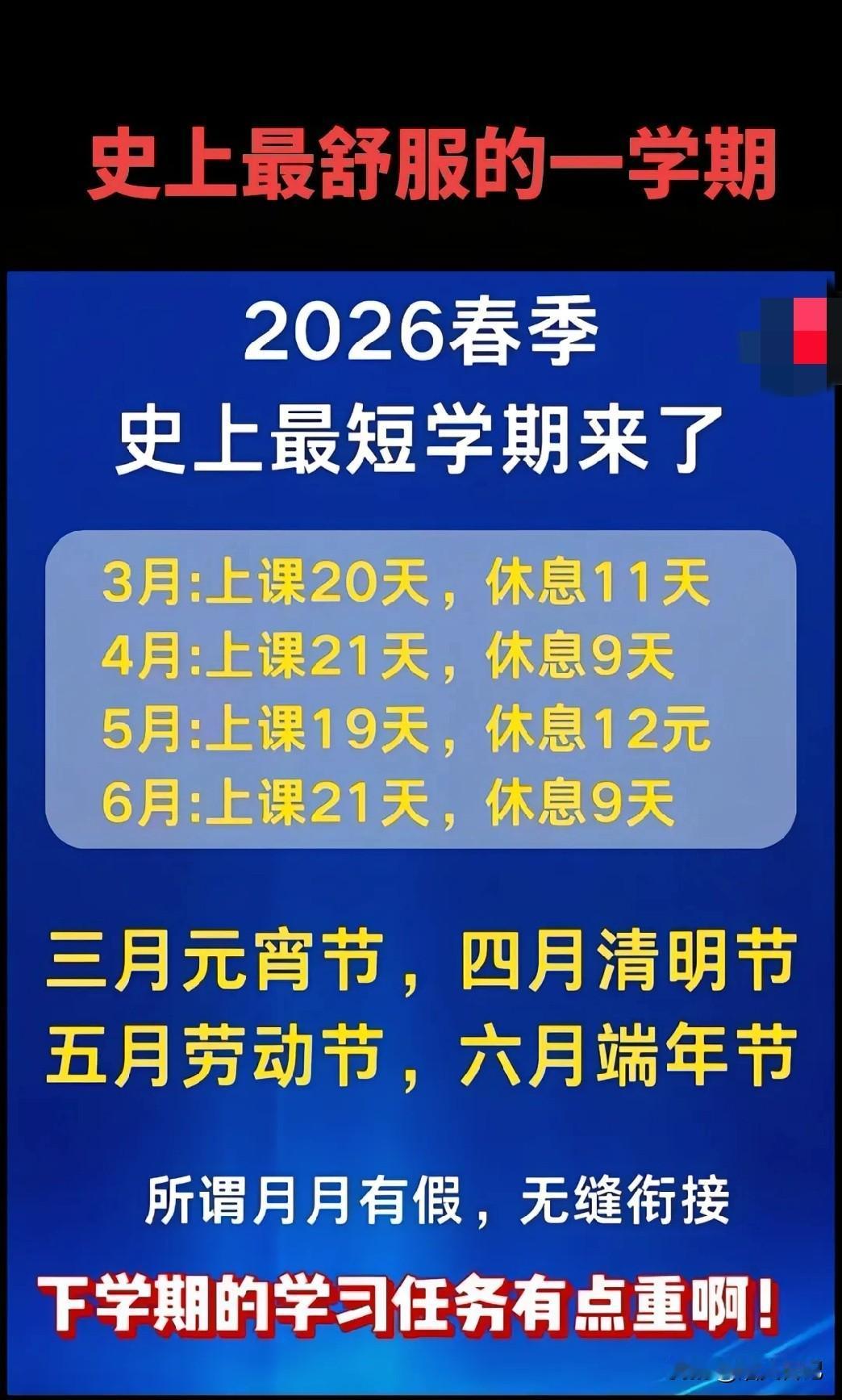 好消息:春季开学月月有假放! 有人说这学期的寒假是史上最长的假期,其实也没有多几天。平常寒假大概在腊月十七、八左右放假,今年也没有提前几天,年后开学时间是一致的。 不过说春季这学期的上学时间确实是史上最短的一个学期,满打满算一学期上课时间大概是81天左右,对于即将毕业统考年级的孩子来说,确实学习也算是比较紧张了。 三月份上课时间是20天、四月份上课时间是21天、五月份上课时间是19天、6月份上课时间是21天,对于6月7、8号要高考的同学来讲,上课时间确实很紧张。对于其他年级的同学来说,可以是月月有假放,无缝衔接! 上半年的假期比下半年的假期是要多一些,三月元宵节、四月清明节、五月劳动节、六月端午节。所以孩子们要合理安排假期! 下学期的时间较短,那我们的教学任务也相对来说会紧张一些,孩子们学习的压力也会增加一些,因为课程内容没有减少,那只能在教学进度上加快脚步,那对于孩子们来说,考验大家的时候就到了。 今天带着孩子去书店逛了一圈,可以说相当热闹。有家长带着孩子买资料的,有孩子自己在里面看书,有大人陪着孩子一起阅读的,确实是热闹非凡。不过书店这个地方也确实挺好,‘冬暖夏凉’适合孩子们待。合理安排假期,无形之中也是在分担下学期的压力。 祝愿孩子们假期快乐! 声明:个人观点,仅供参考!没有任何带节奏的说明,请大家保持理性看待!