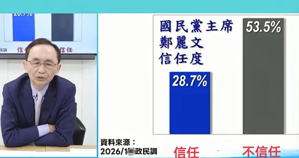 最新民调:郑丽文信任度 28.7%、不信任度 53.5% 1 月 30 日晚间,媒体人吴子嘉在电视节目上一下子抛出了一份《美丽岛电子报》的最新民调,瞬间引发热议。 要知道国民党很少单独给党主席做信任度调查,这次 28.7% 的信任率和 53.5% 的不信任率摆出来,明眼人都能看出,郑丽文这大半年的主席当得确实不轻松。 吴子嘉在节目里拿着数据狠批,说这结果跟郑丽文的主张完全对不上,甚至放话要 “修理” 她。 但熟悉岛内政治的都清楚,这数据背后可不是简单的 “支持或反对”,藏着国民党当下最头疼的路线之争。毕竟郑丽文上任还不到半年,就把自己架在了风口浪尖上。 要说最戳民众神经的,还是前不久那句 “大陆是亲人,美国是恩人”。 本来 1 月 28 号中常会提这茬,她特意加了个 “曾” 字想找平衡,可偏偏赶在国民党要重启国共智库论坛的节骨眼上。 1 月 27 号刚宣布 2 月 3 号要去北京谈两岸旅游、产业合作,转天党主席就给美国戴 “恩人” 帽子,这操作让支持者都看懵了。 孙文学校总校长张亚中直接跳出来要她道歉,这话骂得挺实在:“美国逼着台湾花 1.25 万亿新台币买军火,差额 9500 亿都没说清;又逼着台积电搬去美国,这叫恩人?” 这话戳中了很多人的痛处,台湾社交平台上全是吐槽,有人说 “连谁利用我们都分不清楚,怎么带队伍”,还有人直接要 “明确立场,别搞模糊战术”。 其实郑丽文也不是没做过实在事。之前带头反对那笔天价军购,说 “打仗不分蓝绿都要死”;这次国共论坛也是她力推的,还说工商界朋友天天找她盼两岸和解;弹劾 “台独” 分子时态度也硬得很,连民进党都骂她 “认贼作父”。 可就是这嘴没把住,把之前的努力打了折扣。 更要命的是党内还出了乱子,新竹县长提名闹得一地鸡毛。 吴子嘉在节目里爆料,郑丽文连徐欣莹的电话都没打一个,把人当空气,最后提名破裂全怪她态度恶劣。 国民党本来就派系多,这么一来基层更不服气了,觉得她 “刚当上主席就飘了”。 有人说 28.7% 的信任度不算低,但放在国民党这盘大棋里真不够看。现在岛内选民早不看 “政党招牌” 了,就看你这个人能不能办事。 就像之前苏贞昌、赖清德,都是栽在 “民众看不到成果” 上。 郑丽文这数据,说白了就是大家在给她发 “耐心警告”:光说不练或说多错多,迟早要失去支持。 而且这民调时间点选得也巧,选后热度刚下去,正好用数据引爆新话题。但数据终究是数据,郑丽文要是能接住这波争议,把路线理清楚,未必不能翻盘。 毕竟她喊 “大陆是亲人” 时,67% 的台胞都认同,95% 的年轻人知道 “台独” 会引发冲突,这说明民心其实在两岸和解这边。 现在就看郑丽文怎么选了:是继续搞两边讨好的 “平衡术”,还是干脆站定立场。要是还像现在这样含糊其辞,别说民进党抓把柄,连自己人都要散了。 毕竟台湾民众要的不是 “语言艺术”,是能看到的和平与实惠,这一点,郑丽文要是想不通,下次民调可能更难看。