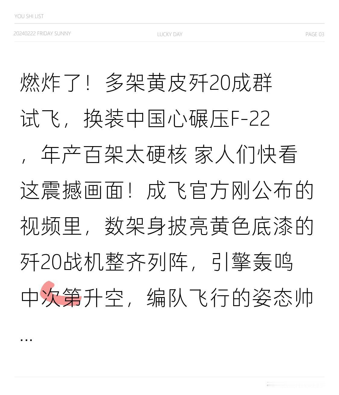 燃炸了!多架黄皮歼20成群试飞,换装中国心碾压F-22,年产百架太硬核 家人们快看这震撼画面!成飞官方刚公布的视频里,数架身披亮黄色底漆的歼20战机整齐列阵,引擎轰鸣中次第升空,编队飞行的姿态帅到炸裂!这可不是普通试飞,而是中国五代机进入“爆兵模式”的实锤,军迷直呼:“这抹明黄,就是最硬核的安全感!” 可能有朋友疑惑:“战机怎么不刷迷彩,披着土黄色外衣就上天?”其实这正是第一个反转!这层黄皮可不是没完工的半成品,而是国军标Y04色号的环氧富锌底漆,掺着实打实的锌粉,能抗住湿热、盐雾、严寒,让机身15年不生锈。而且黄皮机意味着战机已完成总装,进入最后试飞校准阶段,以往各国对这个阶段的战机都严格保密,成飞敢大方公开集群试飞,本身就是技术成熟的底气外露! 更让人惊喜的是第二个转折点:这批黄皮机全是歼20A最新改进型,那个显眼的“粗脖子”设计藏着大玄机!和早期“细脖子”型号比,它的机背抬高、过渡更平滑,不仅能降低10%的跨声速阻力,还多腾出了空间装燃油和先进电子战设备,航程直接增加近300公里,高速突防能力再上台阶。但最核心的升级,是终于换上了万众期待的涡扇-15“中国心”!最大推力达18.5吨,推重比突破10,让歼20A实现真正的超音速巡航,不用开加力就能以1.8马赫长时间飞行,机动性直接碾压美国F-22! 千万别以为这只是几架新机亮相,背后是中国航空工业的体系化突破!成飞现在4条脉动生产线全开,采用模块化组装,每3天就能量产1架,年产能稳定在100-120架,不良率低至万分之三。更牛的是完成了“5地10型”体系化试飞,涵盖有人机、无人机协同等科目,双座版歼20S还能指挥8架无人机集群作战,38秒就能完成“电子压制+精确打击”全流程。截至目前,歼20系列总产量已突破400架,远超F-22的187架,成为全球数量最多的重型五代隐身战机! 还有个细节藏不住实力:歼20A的航电系统直接拉满!氮化镓有源相控阵雷达探测距离达500公里级,能同时跟踪20个以上目标,搭配8面全向窗口的光电瞄准系统,飞行员拥有“透明座舱”般的全景视野。新一代隐身涂层让雷达反射截面积低至0.01平方米以下,雷达波吸收率超95%,隐身性能跻身世界顶尖。从当年靠俄制发动机“将就”,到如今涡扇15量产、5.5代战机批量下线,中国航空工业的逆袭太提气了! 这成群起飞的黄皮歼20,藏着一个民族的奋斗史。曾经我们仰望别人的先进战机,如今靠自己的努力,实现了从“能造五代机”到“能批量造先进五代机”的跨越。这抹亮眼的明黄,不仅是战机的底漆,更是大国崛起的底色;引擎的轰鸣,不仅是试飞的声响,更是自信的宣言。 当我们的战机翱翔蓝天,守护的是每一个普通人的安稳生活。为中国军工点赞,为强大的祖国自豪!你被这波黄皮歼20圈粉了吗?欢迎在评论区聊聊,点赞关注,一起见证中国空军的更强大未来!