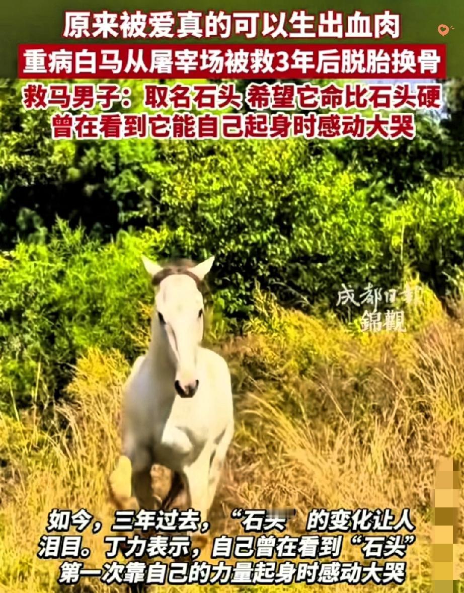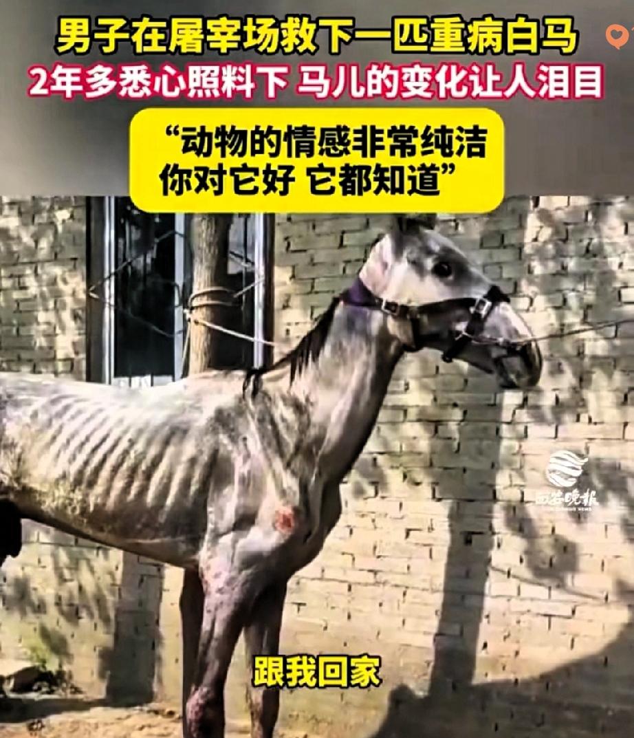 万物皆有灵! 云南昆明这匹待宰病马的遭遇,真的让人又心疼又暖心,谁能想到濒死的灰瘦老马,能被好心人硬生生从鬼门关拉回来,还蜕变成一匹亮眼白马! 丁先生三年前途经屠宰场,撞见这匹瘦到脱相、腿伤站不稳的马,明知没多少肉仍要被宰,当下就心软买下,可它的病情比看着还重,躺下去都难起身,还带着一身病。 身边人都劝他别傻,花钱救这病马纯属打水漂,可他偏说生命就一次,钱没了能再挣,硬是借钱治病,三个月花超10万,每天几千块开销全靠借,喂药护理全亲力亲为。 直到马儿自己稳稳站起那天,他当场号啕大哭,所有委屈辛苦都值了。 如今马儿皮毛雪白油亮,成了俊朗骏马,更把他当唯一亲人,粘人蹭他寻安心,他一坐地就乖乖把头搁他腿上,这份双向奔赴太戳人。 其实从不是丁先生傻,而是他懂生命从无高低,善良从不是权衡利弊后的选择,是刻在骨子里的本能,动物的感恩从不用言语,那份纯粹的依赖,比任何回报都珍贵。 你觉得这份跨越物种的情谊,是不是比很多人情更让人动容? 换作是你,会为了一条陌生生命拼尽全力吗?