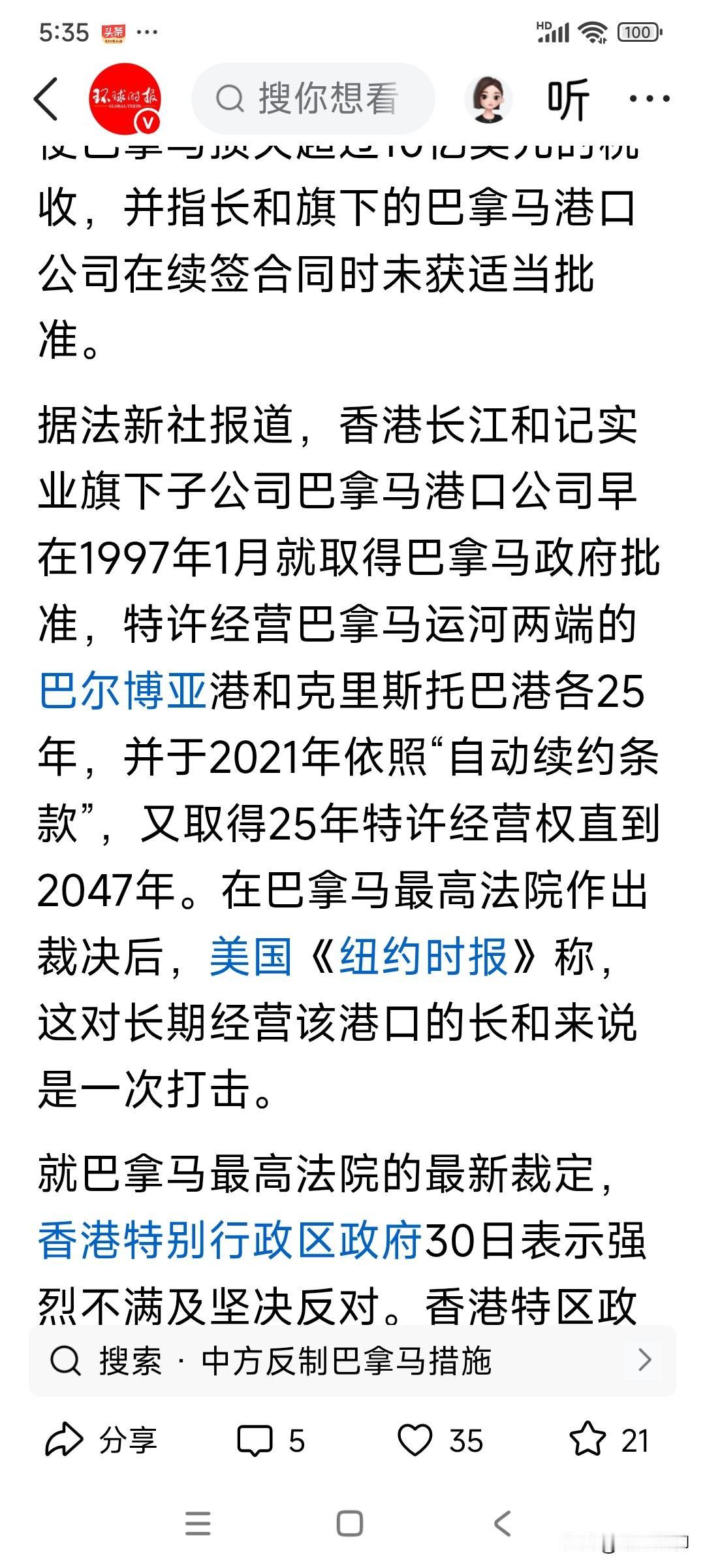 巴拿马最高法院当地时间29日晚通过社交媒体Instagram宣布一项裁决结果:香港长江和记实业(以下简称“长和”)运营巴拿马运河附近两个港口的合同违反宪法,对此网上有些人又开始牛起来了,一股劲的分析,仿佛自己懂得有多牛似的,把一个明显违背契约精神的非法裁定当着“尚方宝剑”一样,把过去网友的正确评论说成是不懂规则,乱抨击纯纯商业活动,我看这些人才缺乏起码的契约精神商业道德民族气节,不是他们一个披着外衣的所谓最高法院裁定,就代表正确,就代表正义,一个屈服压力颠倒黑白的裁定保护的不是这个国家的利益是让这个国家人民走上被殖民的无德,最终的结果是什么我们静待观察,一张歪理邪说的裁定不可能让这个国家繁荣,更不是网上那些人自己卖弄风骚歪理的幌子,依法办事没有错,一纸裁定也不代表胜利,在民族大义国家利益面前,中国人的利益不可能就那样被侵犯,不齿的美梦也不能得逞,哪里有压迫哪里就有反抗,否则这个世界会变成什么样子?什么时候都要相信正义,它可能迟到但绝不会缺席,世界不可能一个国家说了算。