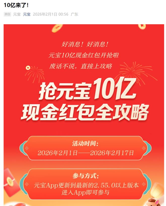 1月25日,腾讯官方发布《关于春节分10亿现金的通知》:在2月1日上线春节活动,用户上元宝App分10亿元现金红包,单个红包金额可达万元。