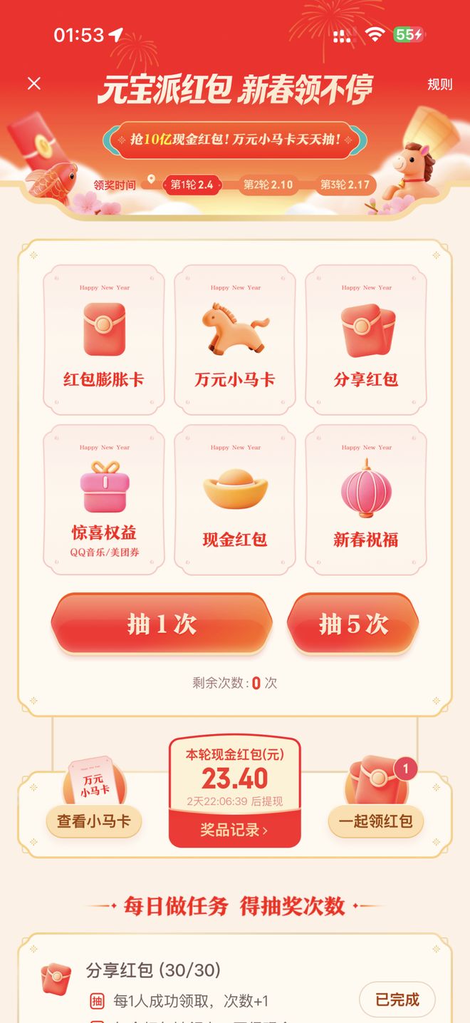第二点,就是不断在各个群里以及朋友圈分享元宝红包,让更多人点开你的分享链接,这样也会增加你的抽奖次数。