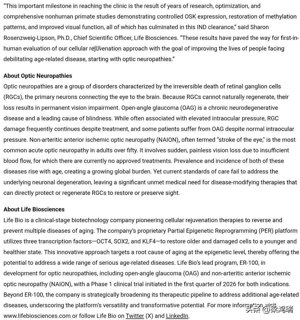 昨天,Life Biosciences 获得了 FDA 的批准,可以开始对 ER-100 进行首次人体试验。ER-100 是一种基于部分表观遗传重编程的细胞再生疗法。 初步试验针对青光眼引起的视力丧失,旨在使细胞恢复到更年轻的功能状态。 这标志着表观遗传再生技术首次进入人体试验阶段,是长寿科学的一个真正转折点。 这是一个重大的科学里程碑。Life Biosciences 在 2026 年 1 月底宣布其研究性新药 (IND) 申请已获得 美国食品药品监督管理局 (FDA) 的批准,获准启动 ER-100 的首次人体临床试验。 这是全球首个获准进入人体试验的基于“部分表观遗传重编程” (Partial Epigenetic Reprogramming) 的细胞再生疗法。 试验核心信息 疗法性质: ER-100 是一种基因疗法,通过在细胞中表达三种山中因子(OCT-4, SOX-2, KLF-4,简称 OSK),在不改变 DNA 序列的情况下重置表观遗传标记,使老化或受损的细胞恢复到更年轻、更健康的状态。 针对疾病: 首批人体试验(Phase 1)将重点针对两种导致失明的严重眼病:开角型青光眼 (OAG) 和 非动脉性前部缺血性视神经病变 (NAION)。 研究目标: 1 期试验(标识号:NCT07290244)主要评估疗法的安全性、耐受性以及免疫反应,同时探索对视力的潜在改善作用。 启动时间: 预计试验将于 2026 年第一季度 正式开始启动。 科学背景 该疗法基于哈佛大学教授 David Sinclair 等人的研究。2020 年,该团队在《自然》杂志发表论文,证明了通过重编程可以逆转小鼠视网膜细胞的年龄并恢复视力。此次获批意味着这种“抗衰老信息理论”将首次在人类身上进行验证。 Life Biosciences 表示,其平台技术在未来可能不仅限于眼科,还有望扩展到治疗肝脏疾病和其他与年龄相关的退行性疾病。