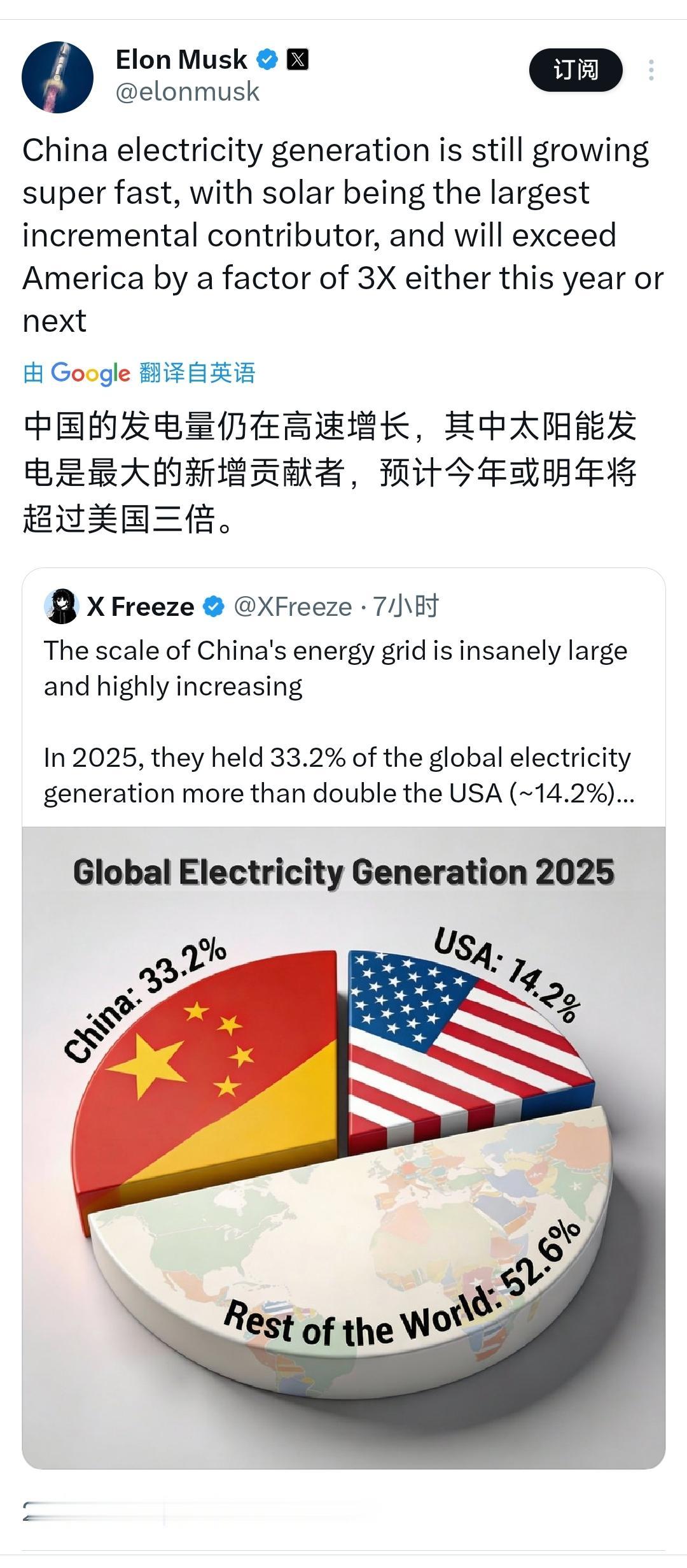 马斯克发文爆赞中国的发电量! 2月1日凌晨,硅谷“钢铁侠”马斯克在社交媒体上发了一张足以让华盛顿彻夜难眠的饼图。数据显示,2025年全球发电量中,中国一家就占了33.2%,而美国只剩下14.2%。马斯克更是直言不讳:中国发电量还在疯长,今明两年可能就要达到美国的3倍。 说白了,在2026年这个AI大爆发的节骨眼上,电力已经不再是简单的生活物资,它就是数字时代的“石油”,是算力的“母乳”。 马斯克之所以这么焦虑,是因为他看透了一个残酷的现实:未来的AI竞赛,拼到最后不是拼谁的算法更精妙,而是拼谁的插座更有劲——实际上马斯克也确实说过类似的话。 然而,现在美国的数据中心像吞金兽一样吃电,但美国的电网却像个风烛残年的老人。数据显示,美国70%的电网设施已经服役超过30年,变压器老化严重,扩建一个变电站光审批可能就要五年。 反观中国,我们正在进行一场人类历史上规模最宏大的“捕光捉影”。2025年,中国新增的发电装机容量竟然是美国的7倍!更绝的是,这些新增电量里,八成以上来自风能和太阳能。 这就好比两个拳击手在台上对垒,美国还在费劲地从老旧的油箱里抽油,而中国已经给自己装上了一套无限续航的太阳能充电宝。 进一步说,这种差距背后隐藏着一个深刻的政治经济学逻辑:能源的本质正在从“资源属性”转变为“制造属性”。 在20世纪,谁控制了中东的油田,谁就掌握了霸权,因为能源是“挖”出来的。 但在21世纪,却不一样了! 现在,能源是“造”出来的——对于中国来说尤其是这样 。中国凭借全球最完整的光伏产业链、最先进的特高压输电技术,硬生生地把能源变成了一种可以大规模工业化生产的商品。 这种“制造能源”的能力,让中国在面对AI浪潮时,拥有了美国梦寐以求的“能源自由”。当硅谷的科技巨头们还在为数据中心能不能拉到专线而发愁时,中国的绿电正通过特高压线路,从大漠戈壁源源不断地输送到东部的算力集群。 这就是马斯克口中那个“令人不安的优势”。 实事求是讲,马斯克的这番话,其实是在给美国政客敲丧钟。他想告诉那些整天忙着搞制裁的人:你们封锁得了芯片,却封锁不了太阳,更封锁不了中国建设基础设施的执行力。 归根结底,大国的竞争从来不是在实验室里完成的,而是在那一根根电线杆、一座座变电站和一片片光伏板中决出的。当一个国家的发电量达到对手的3倍时,所谓的“脱钩”和“围堵”,在绝对的物理能量面前,终将变成一场自欺欺人的幻梦。 以上是小编个人看法,如果您也认同,麻烦点赞支持!有更好的见解也欢迎在评论区留言,方便大家一同探讨。