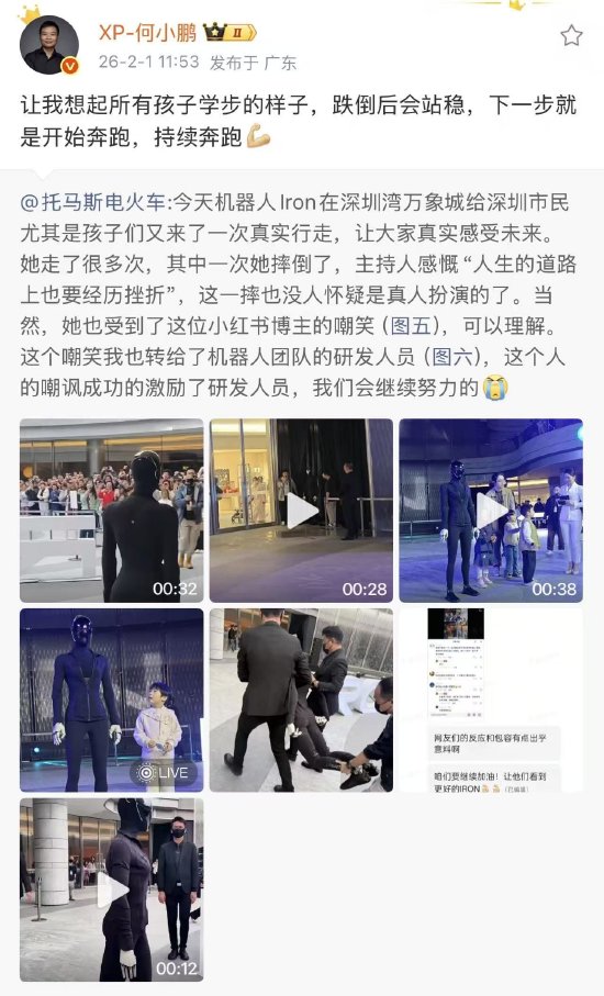 小鹏汽车副总裁于涛通过微博账号“托马斯电火车”表示,机器人IRON在深圳湾万象城给深圳市民尤其是孩子们又来了一次真实行走,让大家真实感受未来。她走了很多次,其中一次她摔倒了,主持人感慨“人生的道路上也要经历挫折”,这一摔也没人怀疑是真人扮演的了。
