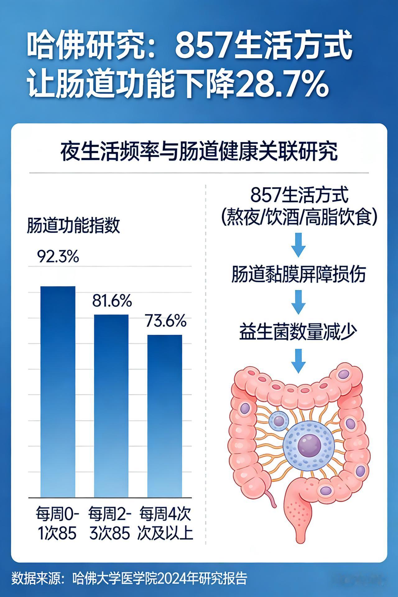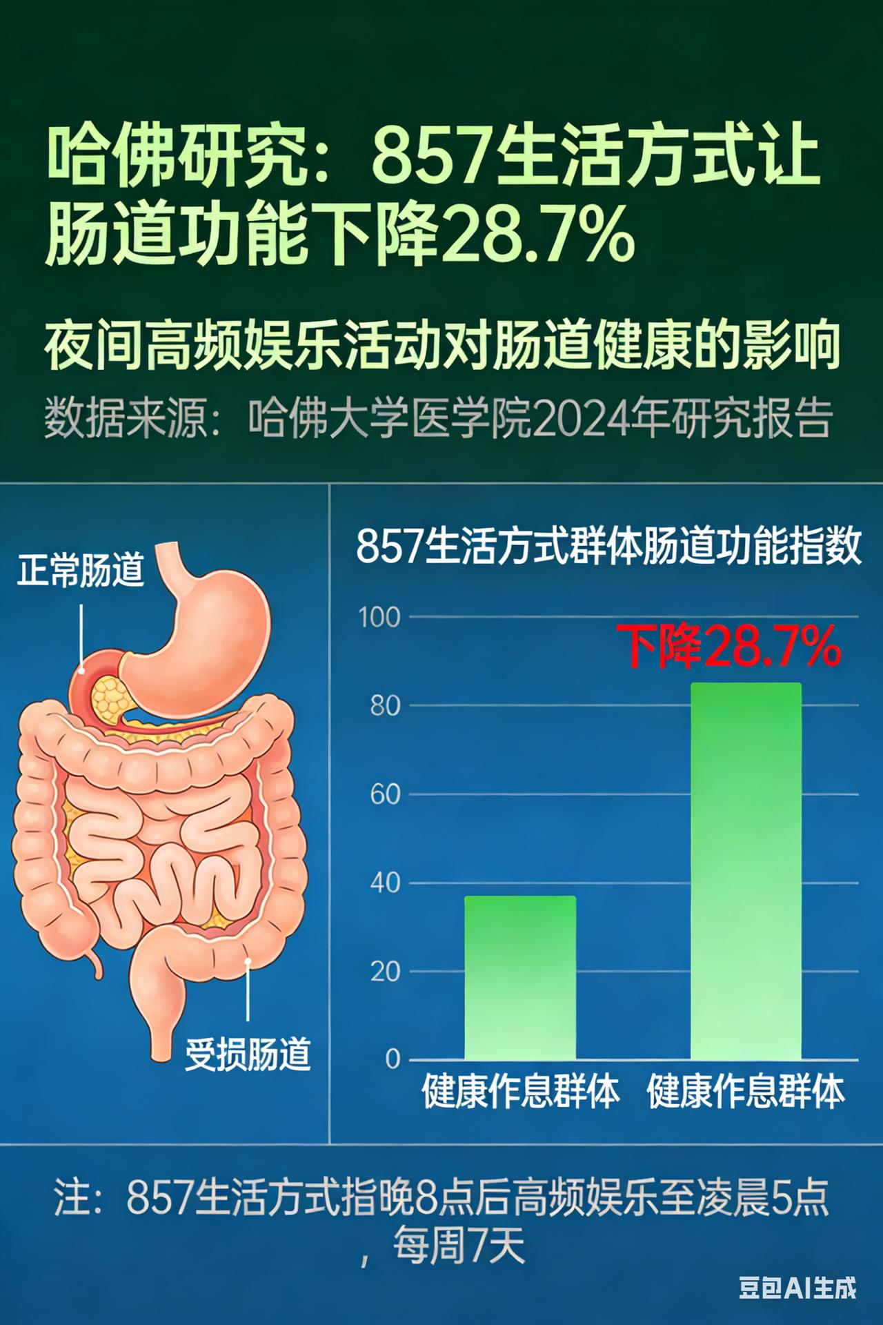夜店常客 21 岁猝死,医学数据揭示 857 致命真相 00后女孩一周7次857,肠烂离世:纵欲的代价,你无法承受 在当下这个多元且充满诱惑的时代,“857”文化悄然在年轻群体中蔓延开来。所谓“857”,即晚上8点出门,凌晨5点回家,一周7天循环往复,它代表着一种夜夜笙歌、纸醉金迷的纵欲生活方式。然而,一位00后女孩的悲剧,却如同一记重锤,狠狠敲醒了那些沉迷于这种生活的人们。 初入“857”世界,迷失在虚幻快乐中 这位女孩名叫晓妍,原本是个青春活泼、充满朝气的00后。她刚刚步入社会,对周围的一切都充满了好奇与探索欲。一次偶然的机会,她被朋友拉去了“857”派对。那闪烁的灯光、震耳欲聋的音乐、热情奔放的人群,瞬间将她淹没。在这里,她可以暂时忘却工作的压力、生活的烦恼,尽情地释放自己。晓妍很快就爱上了这种刺激的感觉,从最初的偶尔参与,逐渐变成了每周7次雷打不动的“派对达人”。 纵欲无度,身体悄然亮起红灯 晓妍沉浸在“857”带来的快乐中无法自拔,却完全忽略了这种生活方式对身体的巨大伤害。昼夜颠倒的作息让她的生物钟彻底紊乱,身体得不到充分的休息和恢复。长期处于嘈杂、混乱的环境中,她的精神也变得高度紧张和疲惫。 而酒精,更是成了她每晚的“标配”。为了融入派对氛围,她一杯接一杯地喝酒,从最初的浅尝辄止到后来的酩酊大醉。大量酒精的摄入,严重损害了她的肝脏、肠胃等器官。同时,派对上的食物大多高油高盐高热量,缺乏必要的营养,进一步加重了她身体的负担。 渐渐地,晓妍的身体开始出现各种不适症状。她经常感到腹痛、腹胀,消化功能也越来越差,但她并没有把这些当回事,依旧继续着她的“857”生活。 病情恶化,生命戛然而止 直到有一天,晓妍突然感到腹部一阵剧痛,这种疼痛比以往任何一次都要强烈,她疼得在地上直打滚。朋友见状,急忙将她送往医院。 经过医生的全面检查,结果令人痛心疾首。晓妍的肠道已经严重溃烂,多处出现穿孔,情况十分危急。医生们立刻对她进行了紧急手术,但遗憾的是,由于病情过于严重,晓妍的身体已经无法承受手术带来的创伤。最终,她因急性肠道溃烂并发多器官衰竭,永远地离开了人世,年仅21岁。 悲剧背后,是纵欲的沉重代价 晓妍的悲剧并非偶然。据医学研究表明,长期熬夜会打乱人体的内分泌系统,影响免疫功能,增加患癌风险;而长期大量饮酒,会导致肝脏损伤、胃炎、胃溃疡等疾病,严重时甚至会引发肝硬化、肝癌等致命疾病。此外,不健康的饮食也会破坏肠道菌群平衡,降低肠道免疫力,增加肠道疾病的发生几率。 晓妍的故事给我们敲响了警钟。在这个物欲横流的时代,我们不能被一时的快乐和刺激冲昏头脑,而忽视了身体健康。身体是革命的本钱,只有拥有健康的身体,我们才能去追求自己的梦想,享受生活的美好。让我们珍惜生命,远离纵欲,用健康的生活方式拥抱未来。