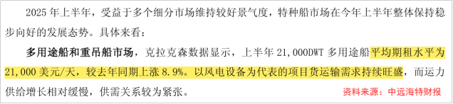克拉克森数据显示,2025年上半年,21000DWT多用途船平均期租租金达到21000美元/天,同比上涨8.9%。