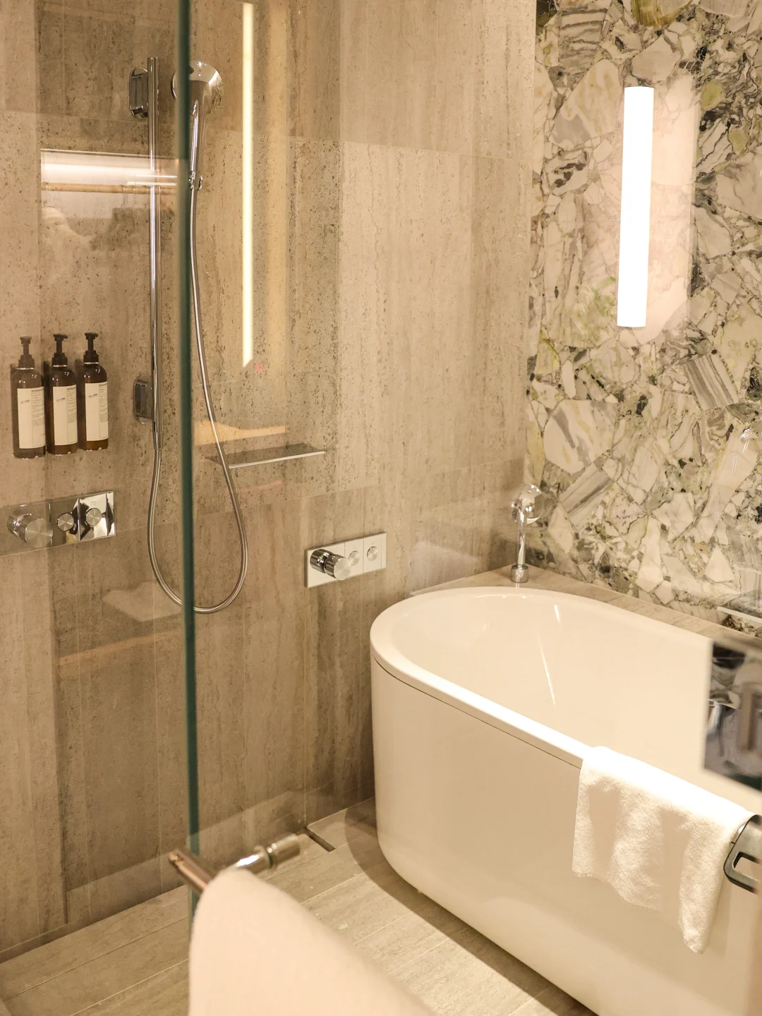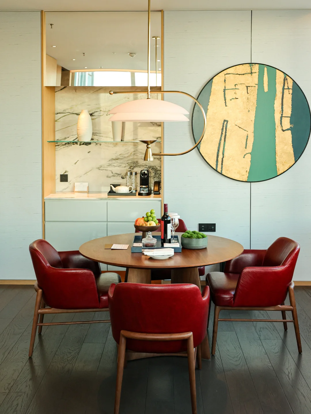 🟩很喜欢套房里的软装,勃艮第红的皮椅经由黄铜灯管过渡到墙面上的孔雀绿画作,没有大起大落的颜色,像是三种风格的展品,放在一起讲同一种审美。