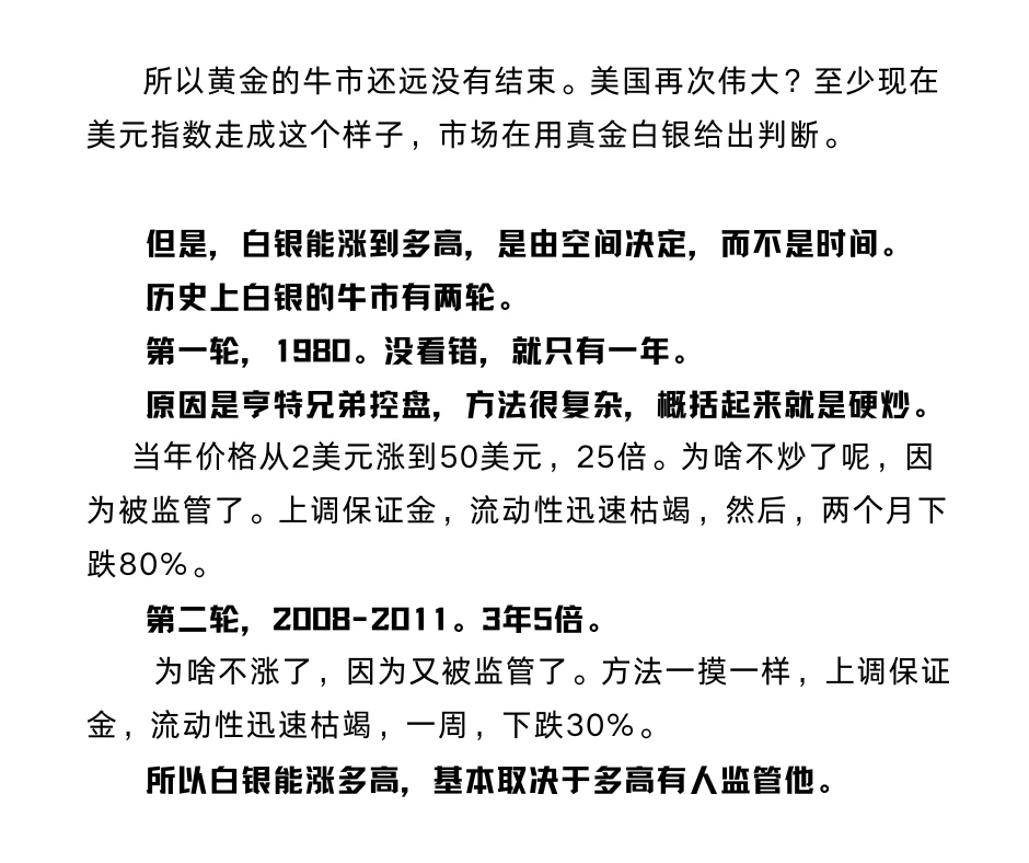 第一轮,1980。就只有一年。原因是亨特兄弟控盘,就是硬炒。从2美元涨到50美元,25倍。
