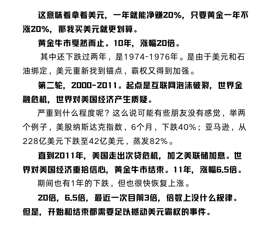 直到1979年,美联储疯狂加息到20%。这意味着只要黄金一年不涨20%,那买美元就更划算。牛市戛然而止。10年,20倍。