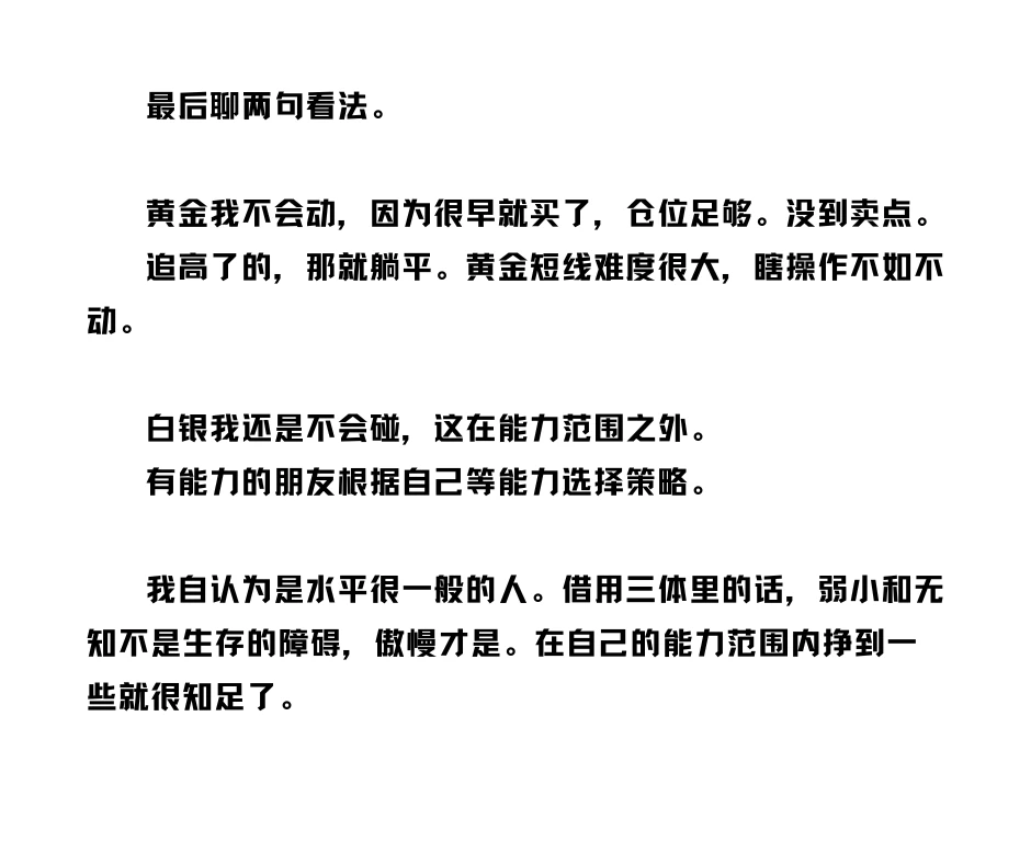 借用三体里的话,弱小和无知不是生存的障碍,傲慢才是。在自己的能力范围内挣到一些很知足了。