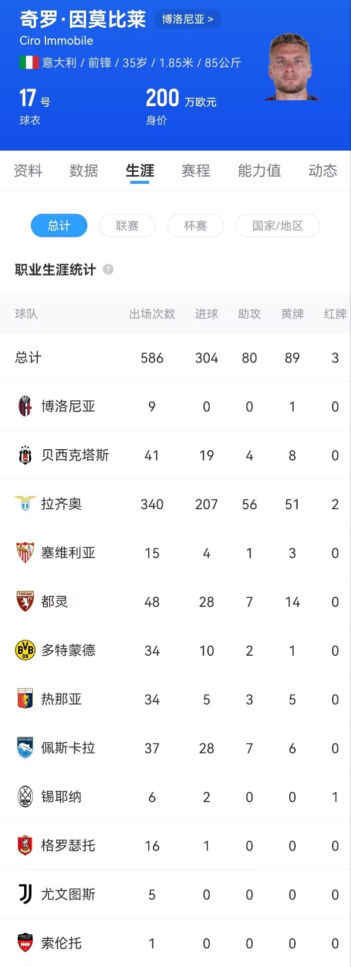 因莫比莱现年35岁,本赛季为博洛尼亚出战9场比赛,没有进球或助攻,出场时间227分钟。