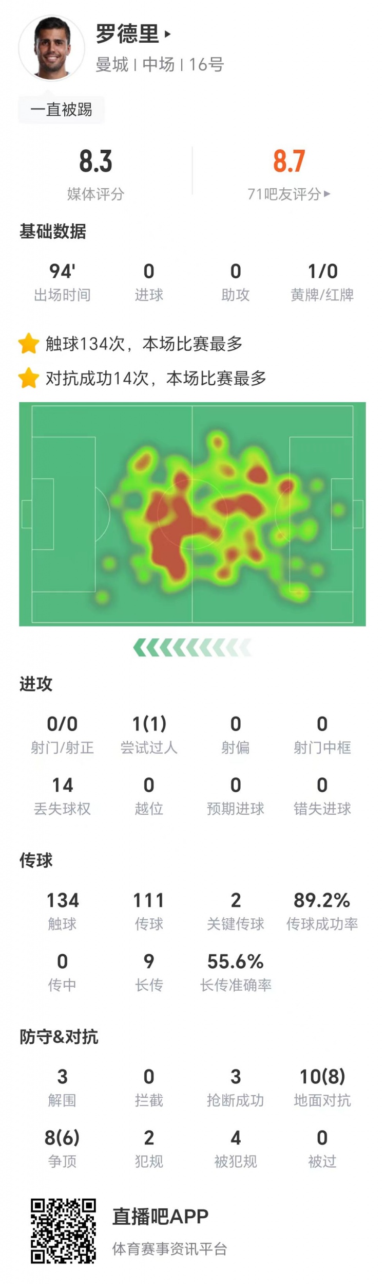 赛后技术统计数据显示,罗德里本场比赛134次触球全场最高,两次关键传球,3次解围,3次抢断,10次地面对抗成功8次,8次争顶成功6次,获评8.3分。