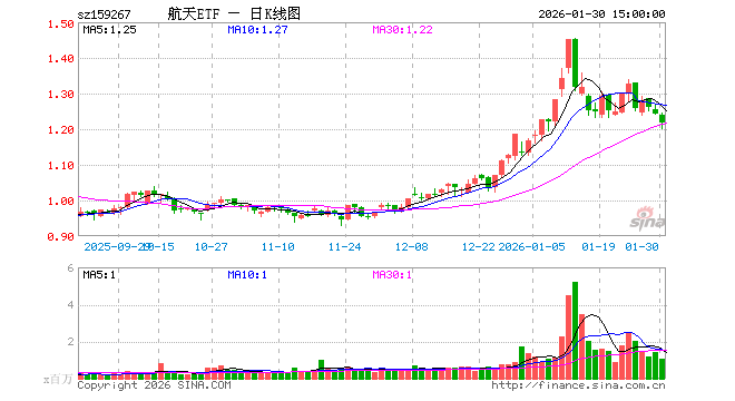 1月30日,航天ETF(159267)跌1.93%,成交额1.32亿元。当日份额增加900.00万份,最新份额为14.45亿份,近20个交易日份额增加8.67亿份。最新资产净值计算值为17.63亿元。
