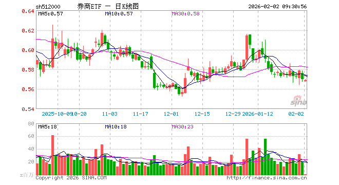 2月2日,券商ETF(512000)开盘跌0.35%,报0.568元。券商ETF(512000)重仓股方面,东方财富开盘跌0.40%,中信证券涨0.04%,国泰海通跌0.15%,华泰证券跌0.35%,广发证券跌0.62%,招商证券跌0.23%,东方证券跌0.10%,兴业证券跌0.44%,申万宏源涨0.39%,中金公司涨0.20%。