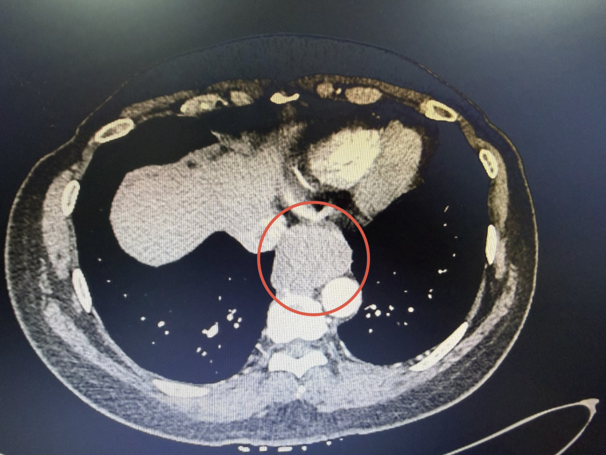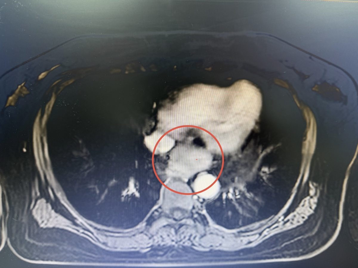 为进一步明确诊断,她来到河南省胸科医院,接受了胸部CT增强、纵隔MRI等检查。影像结果显示,病灶位于后纵隔食管胸下段前方,形态类似“葫芦”,大小约45mm×35mm,呈囊性,与食管左前壁分界欠清,右肺门区淋巴结存在增多增大的情况。综合影像学特征,临床高度怀疑为前肠囊肿等良性病变。