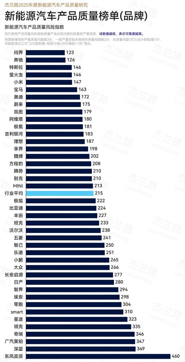 独立汽车数据分析机构杰兰路发布《2025年度新能源汽车产品质量研究》,覆盖57个品牌,回收有效样本超过5,700份,聚焦2-12个月新车车主的实际用车体验。调研结果显示,问界、奔驰、特斯拉位列质量榜单前三,分别以123、126和146的得分(得分越低,可靠度越高)成为年度质量表现最稳定的品牌。