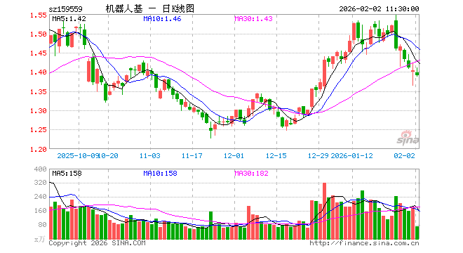 2月2日,截止午间收盘,机器人50ETF(159559)跌0.93%,报1.391元,成交额9827.49万元。机器人50ETF(159559)重仓股方面,绿的谐波截止午盘跌3.56%,双环传动跌1.76%,机器人跌1.27%,石头科技涨1.19%,科沃斯涨0.11%,三花智控跌0.26%,拓普集团跌2.16%,鸣志电器跌1.48%,领益智造涨0.00%,科大讯飞跌2.25%。