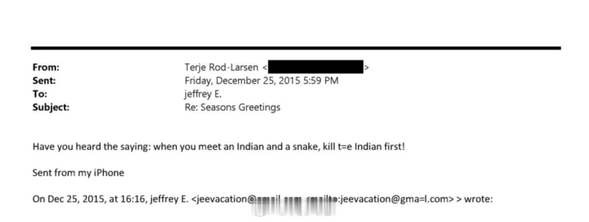 爱泼斯坦文件:2015 年,挪威外交官、国际和平研究所前所长泰耶·罗德-拉尔斯在给杰弗里·爱泼斯坦的一封电子邮件中写道: