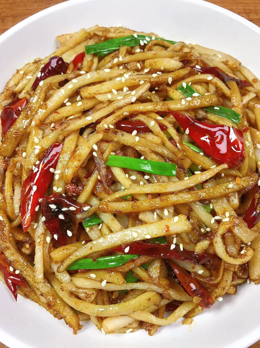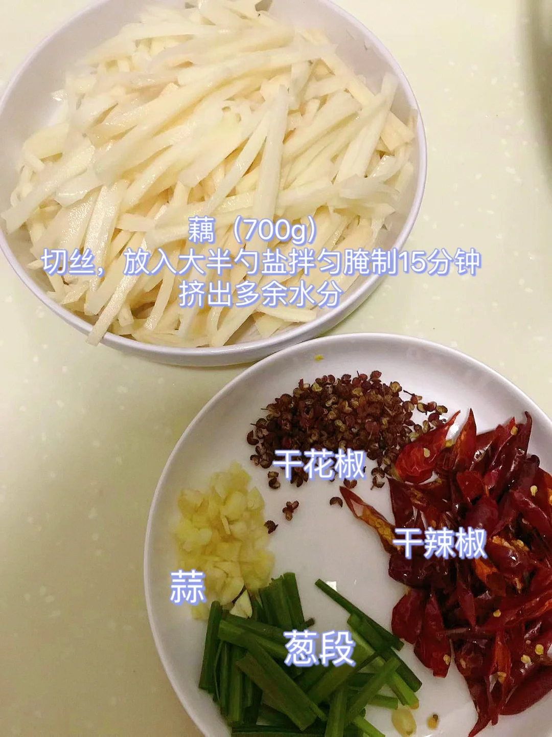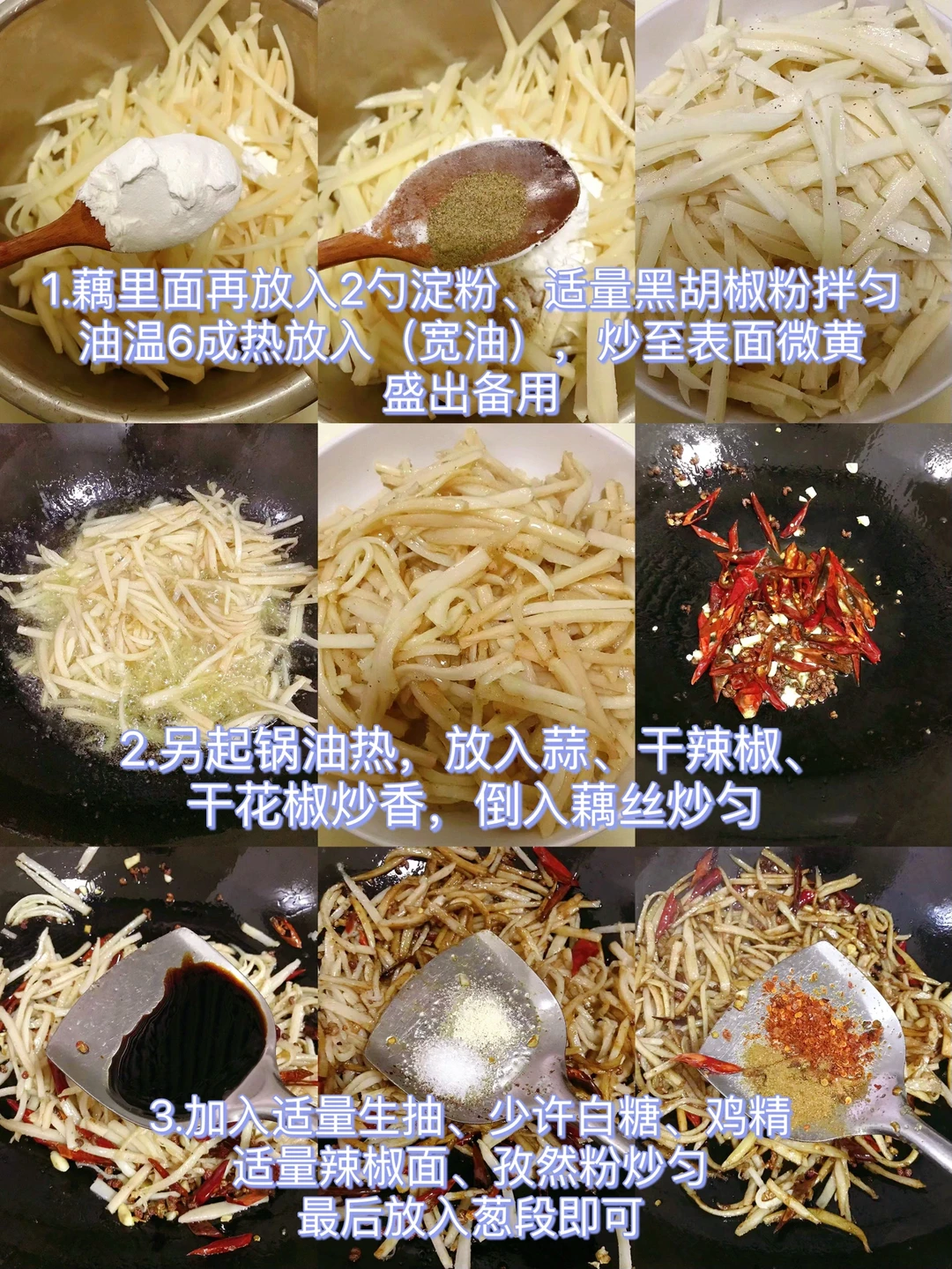 [赞R]今天分享一款干煸香辣藕丝!香辣脆爽,好吃到停不下来!喜欢的赶紧试试吧! [赞R]食材:莲藕(700克)、干花椒、干辣椒、蒜、葱段 [赞R]做法: 1.藕削皮切丝洗净,放入大半勺盐拌匀腌制15分钟挤出多余水分,再放入2勺淀粉、适量黑胡椒粉拌匀,油温6成热放入(宽油),炒至表面微黄盛出备用 2.另起锅油热,放入蒜、干辣椒、干花椒炒香,倒入藕丝炒匀,加入适量生抽、少许白糖、鸡精、辣椒粉、孜然粉炒匀,最后放入葱段即可