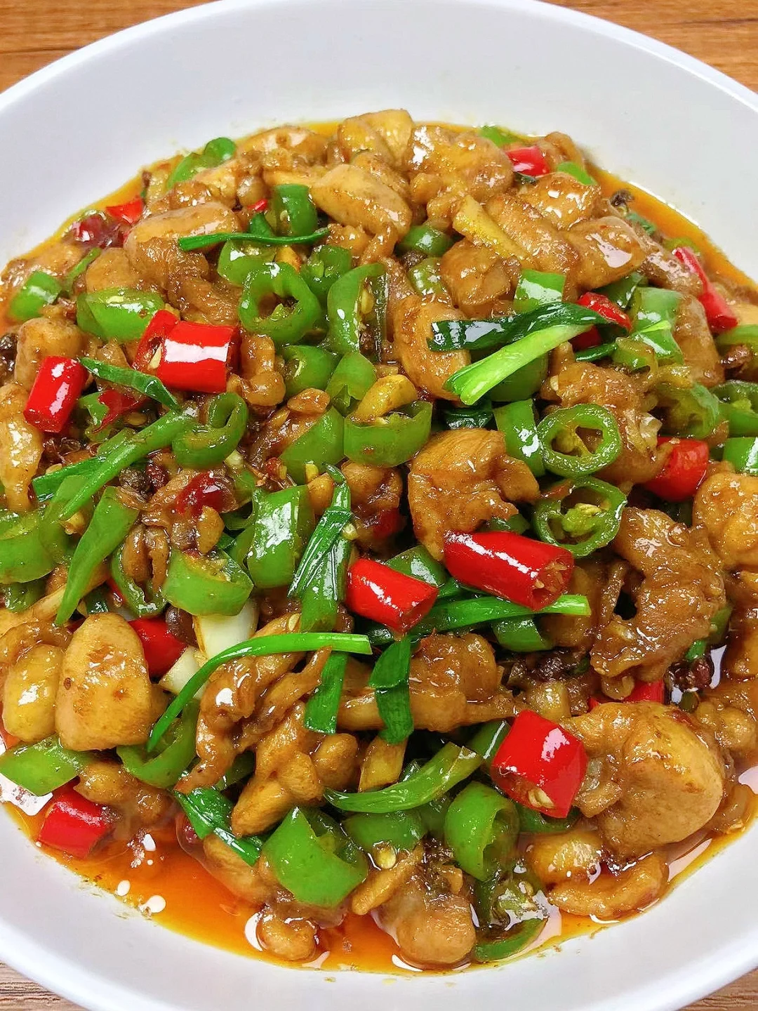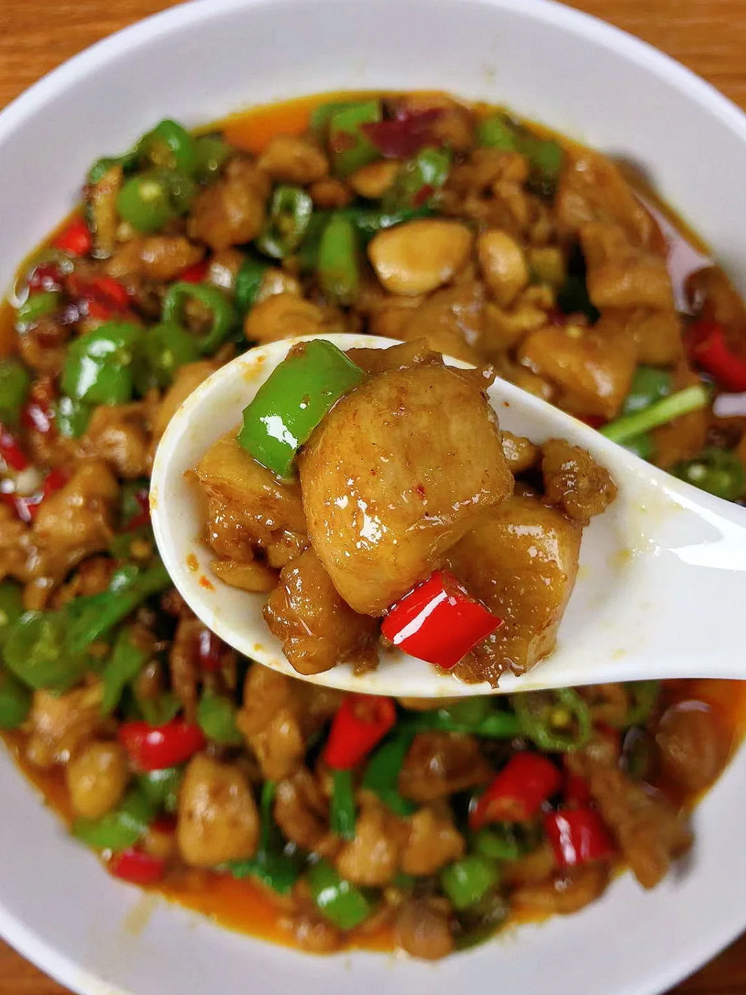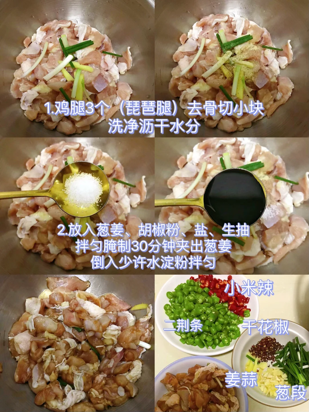 [赞R]今天分享一款香辣鸡丁!麻辣鲜香,好吃到停不下来!喜欢的赶紧试试吧! [赞R]食材:鸡腿(琵琶腿3个)、二荆条、小米辣、姜蒜、干花椒、葱段 [赞R]做法: 1.鸡腿去骨切小块洗净沥干水份(鸡腿提前泡一会儿,一定沥干水分) 2.放入葱姜、胡椒粉、盐、生抽拌匀腌制30分钟夹出葱姜,倒入少许水淀粉拌匀 3.油热(宽油)倒入鸡肉翻炒(一定要多炒一会,炒干水分2分钟左右),锅边淋一圈料酒炒匀 4.放入姜蒜、干花椒、豆瓣酱炒香,加入适量生抽炒匀,倒入青红辣椒继续翻炒2分钟,炒出香味。最后倒入葱段、少许鸡精炒匀即可