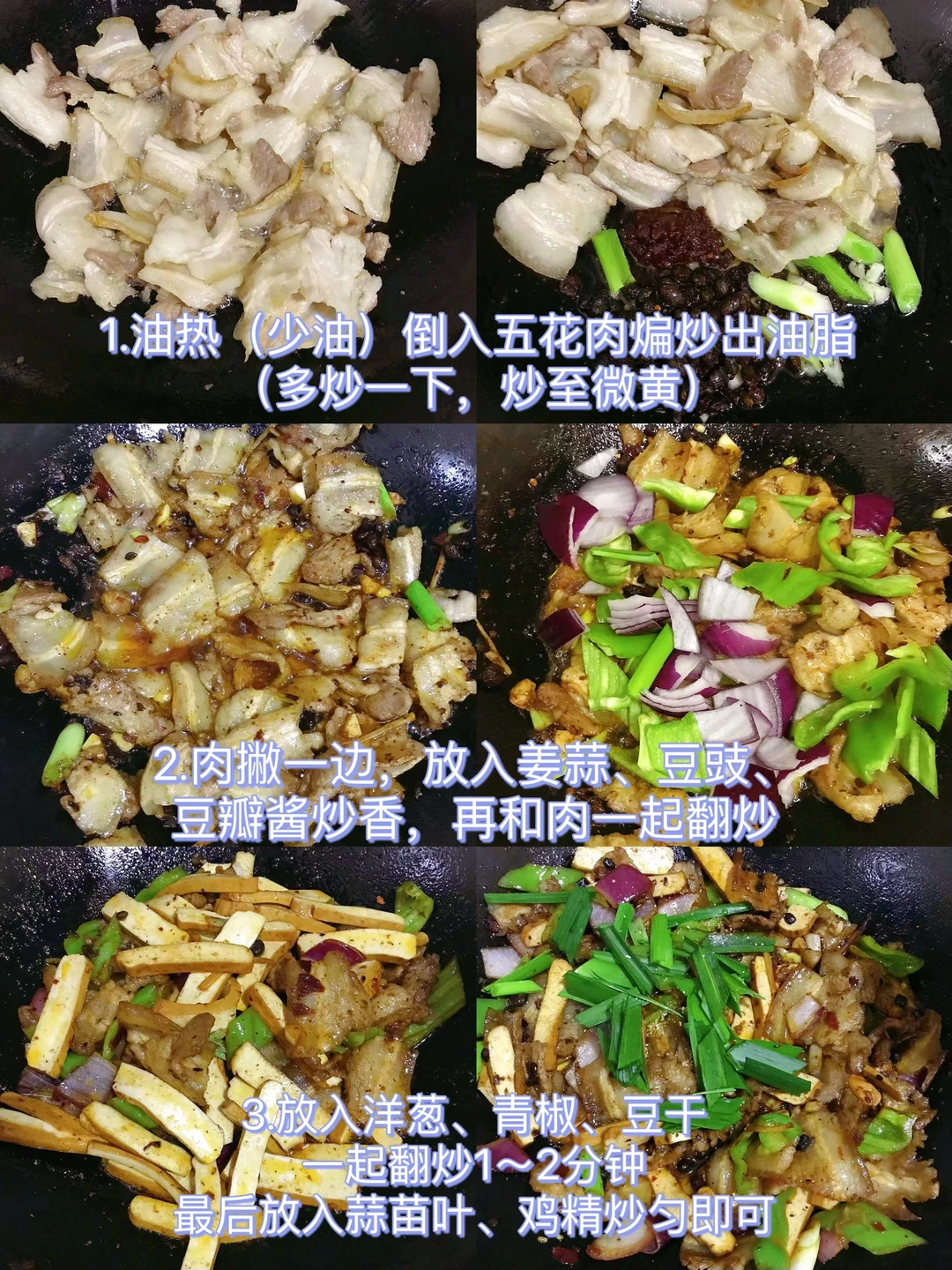 [赞R]今天分享一款盐煎肉!肥而不腻,好吃下饭!喜欢的赶紧试试吧! [赞R]食材:五花肉、厚豆干、豆豉、蒜苗、洋葱、青椒、姜蒜 [赞R]做法: 1.五花肉洗净切薄片;豆干和配菜切好备用 2.油热(少油)倒入五花肉煸炒出油脂(多炒一下,炒至微黄更香),肉撇一边,放入姜蒜、豆豉、豆瓣酱、蒜苗杆炒香,再和肉一起翻炒 3.放入洋葱、青椒、豆干一起翻炒1~2分钟,最后放入蒜苗叶、鸡精炒匀即可 注:酌情加入盐,豆瓣酱和豆豉都比较咸