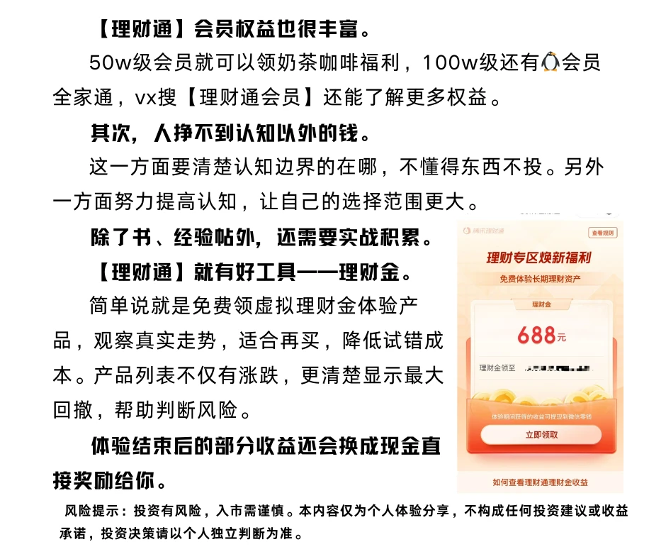 很多朋友在股市里大手大脚,但在现实生活中抠抠搜搜。 在股市里亏个几千一万,似乎能接受,但是丢个100块钱就要心疼一天。 这源于心理学上一个有趣现象——心理账户。说的是人脑会自动把钱存到不同的心理账户里面,然后用不同的态度对待他们。 丢了钱,脑子是把它放在了日常生活账户里,感觉就很直接。亏了钱,则是放在投资的闲钱账户里,感觉就变得很遥远。容易让人产生亏了也没事的错觉。 [火R]其实投资的初衷,是为了让生活更从容,而不是为了 “赌一把” 徒增焦虑。为了能够实现长期稳健理财,有两点是自己一直坚守的。 [爆炸R]首先,选靠谱的平台。 好的平台不仅可以提供可靠的产品,还需要具有完备的分析技能支持和优质的福利权益,帮助我们减少噪音增加收益,实现事半功倍。 平台方面,市面上大多数理财app我都用过,综合下来,理财通还是很不错的。 产品以大机构背景为主。大机构意味着获得了更多人的选择,是市场用脚投票的结果。用户普遍持有时间长,📈情况清晰可见。理财通会员权益也很丰富,50w级会员就可以领奶茶咖啡福利,100w级还有🐧会员全家通,vx搜理财通会员还能了解更多权益。 [爆炸R]其次,人挣不到认知以外的钱。 一方面要清楚认知边界在哪,不懂不投。另外一方面努力提高认知。 投资认知除了书籍、经验帖子以外,还需要通过实战积累。 [爆炸R]理财通就提供了一个好工具——理财金。 简单来说就是免费领取虚拟理财金体验产品,利用理财金观察真实走势和收益,觉得适合再买,降低试错成本。产品列表不仅有涨跌,更清楚显示最大回撤,帮助用户判断风险。 更好的是,体验结束后的部分收益还会换成现金直接奖励给你。 积累认知不是单纯看个涨跌就结束了,还需要详细的分析讲解。 除了常见的各种数据,理财通独有的债市晴雨表可以帮助分析。甚至碰上不懂的,想知道的还有财小通ai助手,直接问就可以。 在任何时候,投资都不是一件简单的事。用好工具总能帮我们在不确定性中,找到更确定的方向。毕竟投资的终极意义,从来不是追求短期暴利,而是让每一分钱都为更好的生活铺路,不用为了碎银几两在日常里纠结,这才是咱们理财的核心诉求。 财经知识 让每一分钱都有方向 AI投资 智能理财 AI交易助手腾讯理财通理财通会员 风险提示:投资有风险,入市需谨慎。本内容仅为个人体验分享,不构成任何投资建议或收益承诺,投资决策请以个人独立判断为准。