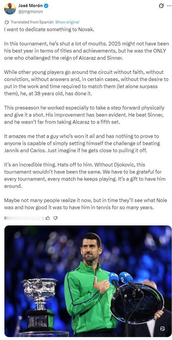 这真是不可思议。向他致敬!没有德约科维奇,本届赛事将黯然失色。我们应当感恩他坚持参赛的每一站、每一场。他的存在本身就是馈赠。