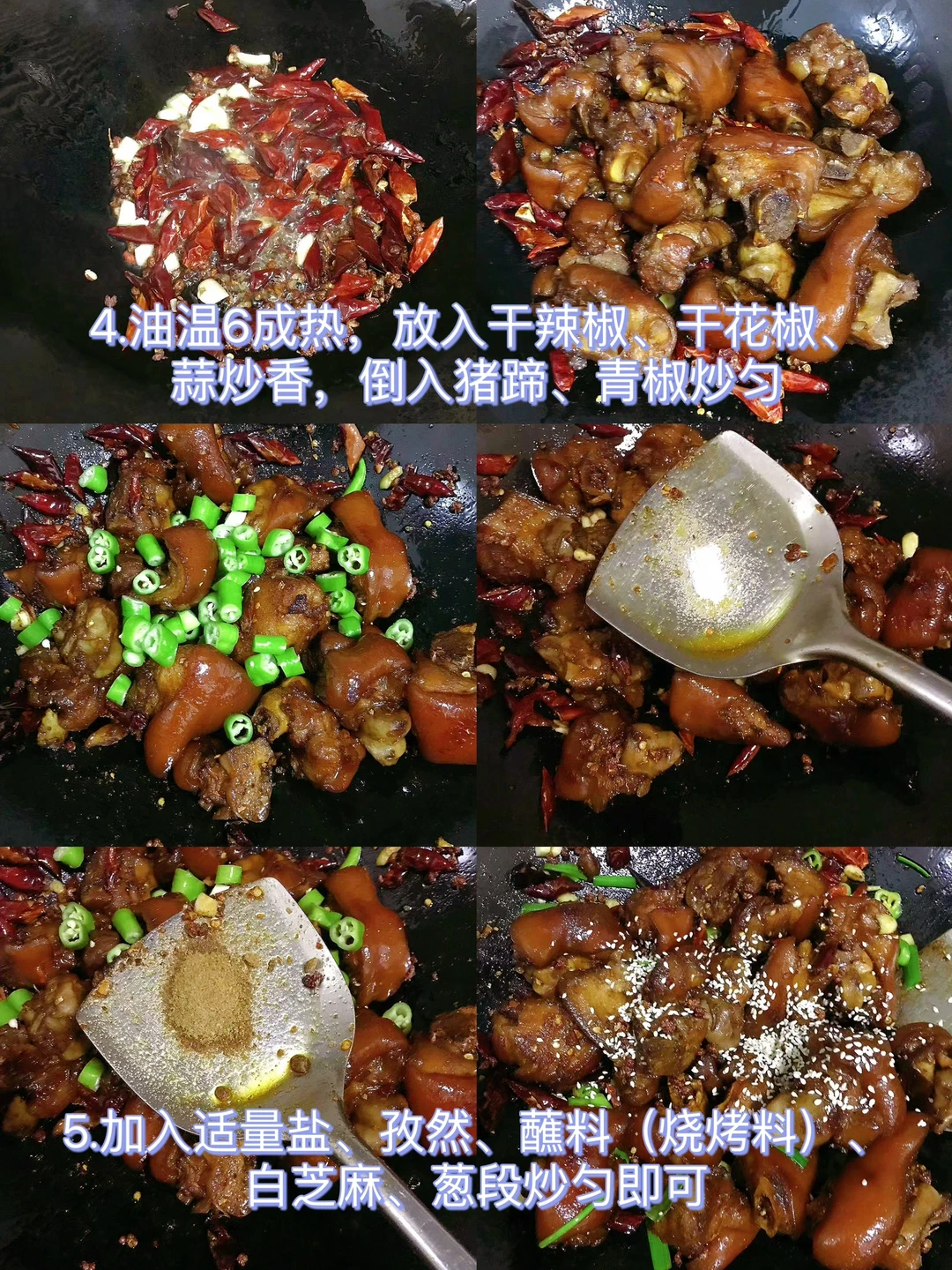 3.另起锅油热,放入干辣椒、干花椒、蒜炒香,倒入猪蹄、青椒炒匀,加入适量盐、孜然、蘸料(直接放烧烤料也可以)、白芝麻、葱段炒匀即可