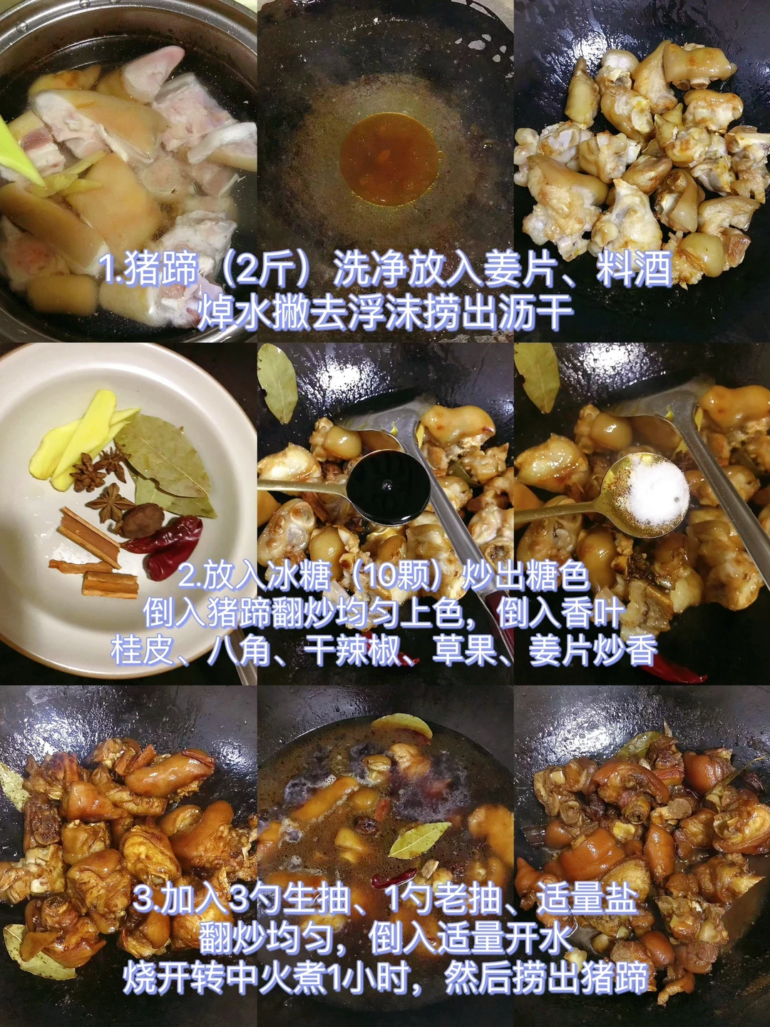 1.猪蹄洗净放入姜片、料酒焯水撇去浮沫捞出沥干;油热,放入白糖炒出糖色,倒入猪蹄翻炒均匀上色,倒入香叶、桂皮、八角、干辣椒、草果、姜片炒香