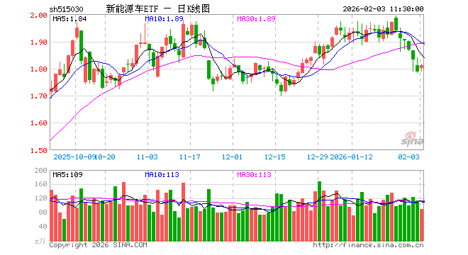 2月3日,截止午间收盘,新能源车ETF(515030)涨1.17%,报1.810元,成交额1.61亿元。新能源车ETF(515030)重仓股方面,比亚迪截止午盘跌0.74%,宁德时代跌1.04%,汇川技术跌0.24%,三花智控涨2.52%,华友钴业涨0.12%,亿纬锂能跌0.54%,赣锋锂业涨1.56%,天赐材料涨0.27%,长安汽车涨0.36%,天齐锂业涨1.32%。