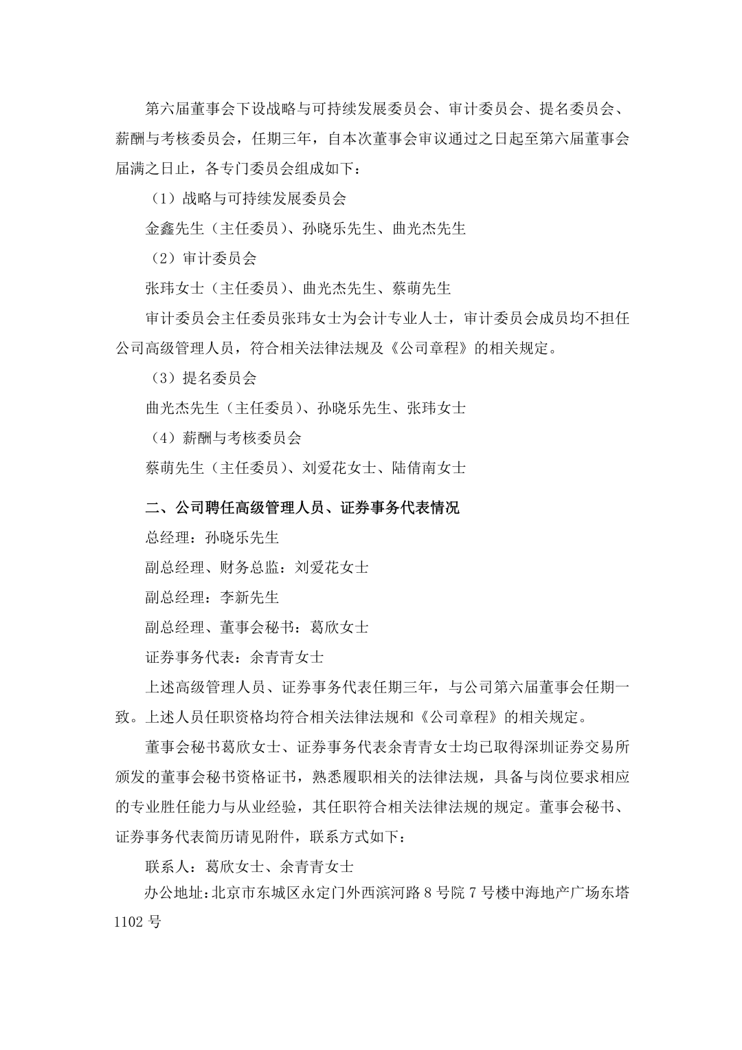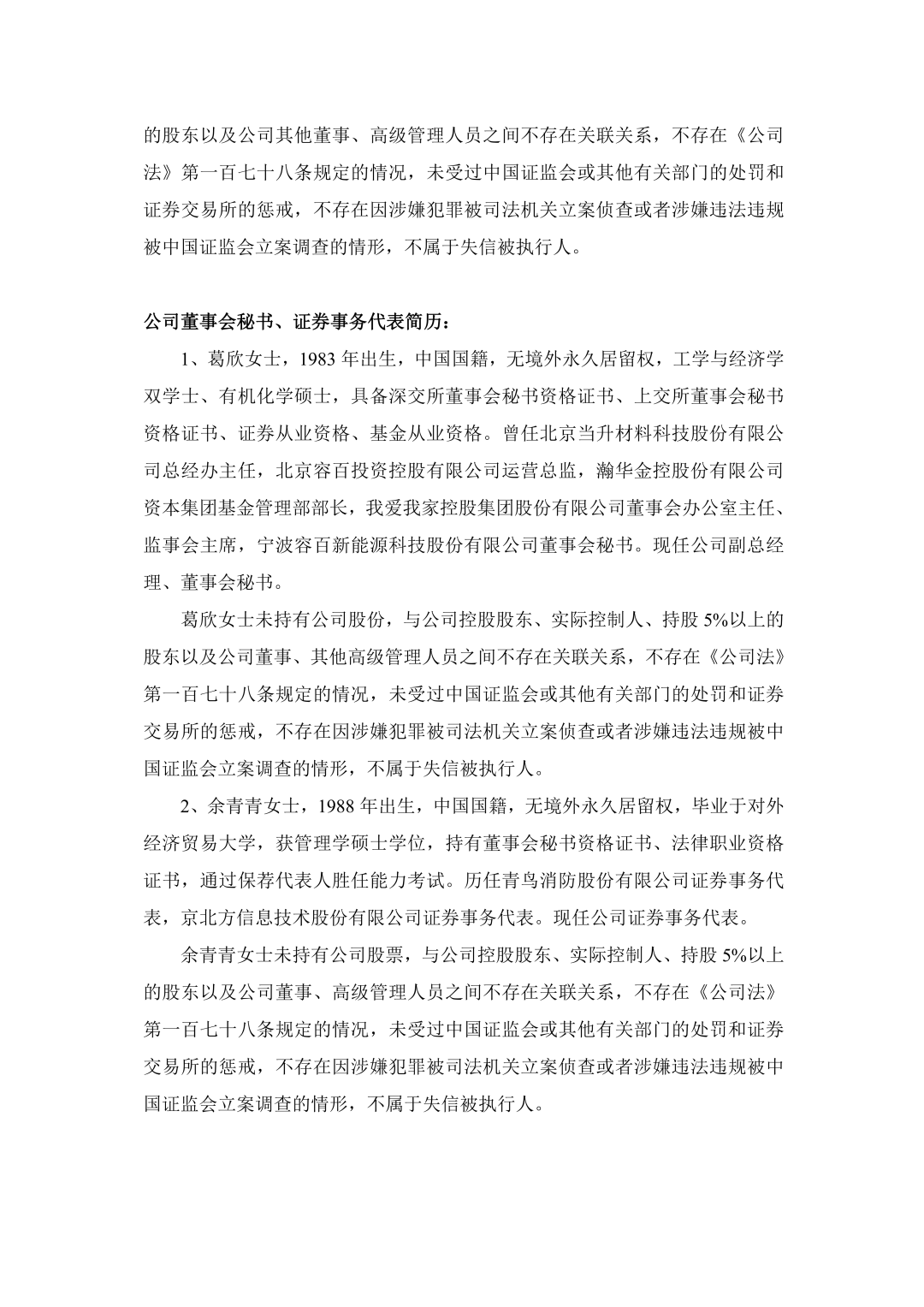 葛欣女士,1983年出生,中国国籍,无境外永久居留权,工学与经济学双学士、有机化学硕士,具备深交所董事会秘书资格证书、上交所董事会秘书资格证书、证券从业资格、基金从业资格。曾任北京当升材料科技股份有限公司总经办主任,北京容百投资控股有限公司运营总监,瀚华金控股份有限公司资本集团基金管理部部长,我爱我家控股集团股份有限公司董事会办公室主任、监事会主席,宁波容百新能源科技股份有限公司董事会秘书。现任公司副总经理、董事会秘书。