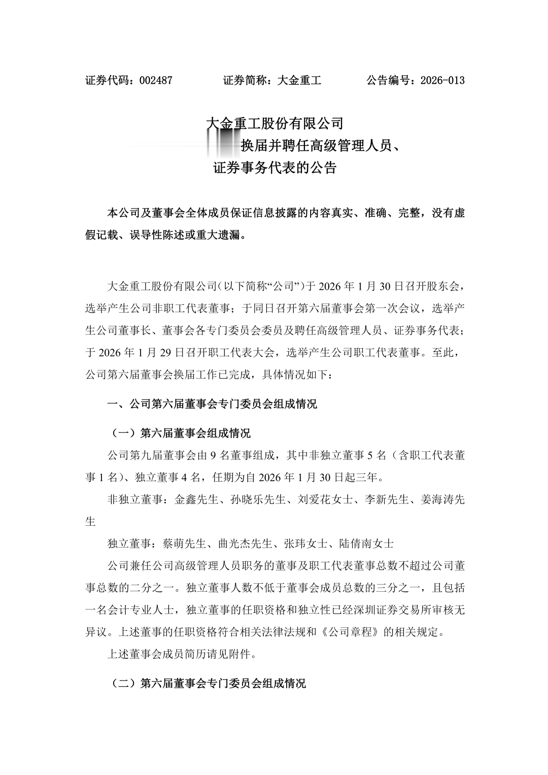 公告披露,大金重工于2026年1月30日召开股东会,选举产生公司非职工代表董事;于同日召开第六届董事会第一次会议,选举产生公司董事长、董事会各专门委员会委员及聘任高级管理人员、证券事务代表。