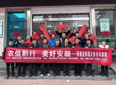 丙午马年新春将至,年味渐浓乡情暖。2026年1月30日,由安顺市社科联、安顺农信深化改革工作组联合主办,安顺市信合文化研究学会、普定农商银行具体承办,安顺市科协鼎力协办,马场镇人民政府积极协助的“农信黔行·美好安顺”新春送祝福活动在普定农商银行马场支行举行。活动将传统年味与普惠金融深度结合,十余位安顺本土书法家挥毫泼墨,上百位村民群众齐聚一堂,在笔墨书香中感受新春祝福与金融关怀,为即将到来的春节增添了层层暖意。