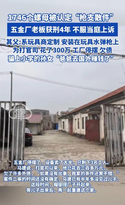 江苏南通,一男子接手父亲的五金厂后,开始生产玩具枪螺母,结果被警方查出有1746个螺母属于枪支散件。法官亲自尝试将6个螺母拧到枪支上,但均未成功,可侦查员表示,那是因为螺母没有抛光,所以无法拧紧。法官又尝试击发时,枪械出现了卡壳情况,但侦查员表示,卡壳不代表不能击发,后经调试顺利击发。检察院提议对男子处10年3个月以上11年有期徒刑以下的处罚,而一审法院判决男子有期徒刑4年。男子不服,当庭提起上诉,可二审迟迟不定。如今62岁老父为救子欠了一屁股债,他也不敢回家面对小孙女想要爸爸的询问。(来源:津云) 据悉,62岁的马先生开这家厂已经20多年了,主要经营业务是制造五金零部件。在儿子马某大学毕业后,他就把马某拉回来承接了这个厂子。 自从马某接手厂子后,他觉得按照以前的经营模式,很难有什么起色,于是开始随大流,承接枪械瞄准镜业务,当时赚了不少钱。 后来马某开始承接一些玩具枪械的配件制作,其中为常州某玩具商就定制过涉案螺母,对方也给出了玩具水弹枪的图纸。 马某有时候做得多了,也会拿到平台上售卖给国内的其他客户。然而就是这个行为,让马某吃尽了苦头。 2022年6月的一个早上,几辆警车驶入马先生家的厂子,随后通知马先生到厂里接受调查。在一阵搜查后,警方缴获了1977个螺母。 当天马某也被警方带走了,马先生这才知道,马某生产的玩具枪螺母在珠海那边被查获了。 后警方将从马先生的厂子缴获的这些螺母送去鉴定中心,经过一番鉴定,其中有1746个被认定为枪支散件。警方表示,这些螺母与AR-15步枪的枪管螺母高度一致,能实现互换,具有专用性。 但是马某认为这批螺母是玩具商给了图纸制造的,自己一直认为是给玩具枪生产的配件,没有制造枪支散件的主观故意。 后检察院以马某涉嫌非法制造、买卖枪支罪提起公诉,并建议对马某处10年3个月至11年有期徒刑。 在法庭上,法官为了验证,当庭拿起马某制造的6个涉案螺母试图拧到枪支上,结果都失败了。 可侦查人员作为证人出庭作证时,解释这些螺母是没做抛光,丝口全是毛刺,所以根本拧不紧。 在侦查人员安装完螺母后,法官试图击发一下,但出现了卡壳现象。后经侦查人员调试,枪支顺利击发。 侦查人员表示,虽然马某生产的螺母与真正枪械上的螺母不一致,但已经完全可以做到替换了。 对此,马某的辩护律师提交了一份司法鉴定意见书,其中显示涉事螺母与国内枪械配件不匹配,但与国外制式枪械以及仿真游戏枪匹配。且按照行业技术标准,涉事螺母只是枪械的辅助配件,并非主要功能的零部件。 可万万没想到,法院并未采纳司法鉴定意见书上的鉴定意见,认为该意见所对应的检材来源不明。 后法院还是认定马某的行为构成非法制造、买卖枪支罪,且情节严重,故判处其有期徒刑4年。 马某不服判,当庭提起上诉。 很多网友看到这个判决后,吓出了一身冷汗:“按这逻辑,卖钢管的都得抓,因为能改成枪管。” 还有网友表示,这只能算是枪支零部件,又不是枪支,怎么能算制造枪支罪? 《公安机关涉案枪支弹药性能鉴定工作规定》第3条规定,......(四)对制式枪支、弹药专用散件(零部件),能够由制造厂家提供相关零部件图样(复印件)和件号的,一律认定为枪支、弹药散件(零部件)。(五)对非制式枪支、弹药散件(零部件),如具备与制式枪支、弹药专用散件(零部件)相同功能的,一律认定为枪支、弹药散件(零部件)。 虽然马某生产的螺母与真正的枪支螺母并不一样,但从技术角度来讲是可以互换的,这就相当的麻烦,极有可能被认定为枪支散件。 《关于审理非法制造、买卖、运输枪支、弹药、爆炸物等刑事案件具体应用法律若干问题的解释》第7条规定,非法制造、买卖、运输、邮寄、储存、盗窃、抢夺、持有、私藏、携带成套枪支散件的,以相应数量的枪支计;非成套枪支散件以每30件为一成套枪支散件计。 也就是说,马某制造的螺母一旦被认定为枪支散件,那马某的行为就违法了。 按照规定,非法制造、买卖非成套枪支散件50件以上,属于“情节严重”,量刑是从10年有期徒刑起步。 马某所生产的1746个螺母均被认定为枪支散件,这也是马某获罪的原因之一。 如果光从法律上来看,马某的行为的确构成了犯罪,没有什么好辩驳的。况且马某之前生产过枪械的瞄准镜,其应当对枪械配件有了一定认知,并非什么都不知道的小白。 因此,在法律规定没有作出对枪支散件的认定更改之前,马某的情况是很难得到改变的。 最后,为了避免再出现马某的情况,在承接制造玩具枪配件的时候,最好是对配件的规格等做个鉴定,确认是否属于枪支散件,千万不要轻易去生产。 对此,您怎么看?欢迎留言交流。