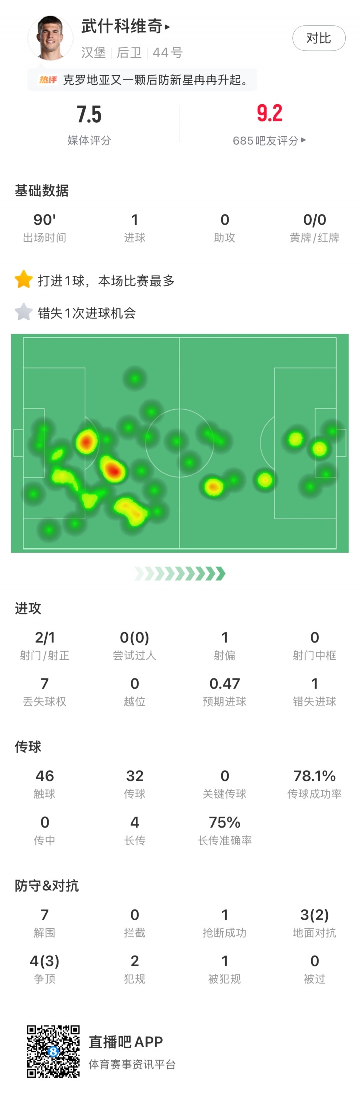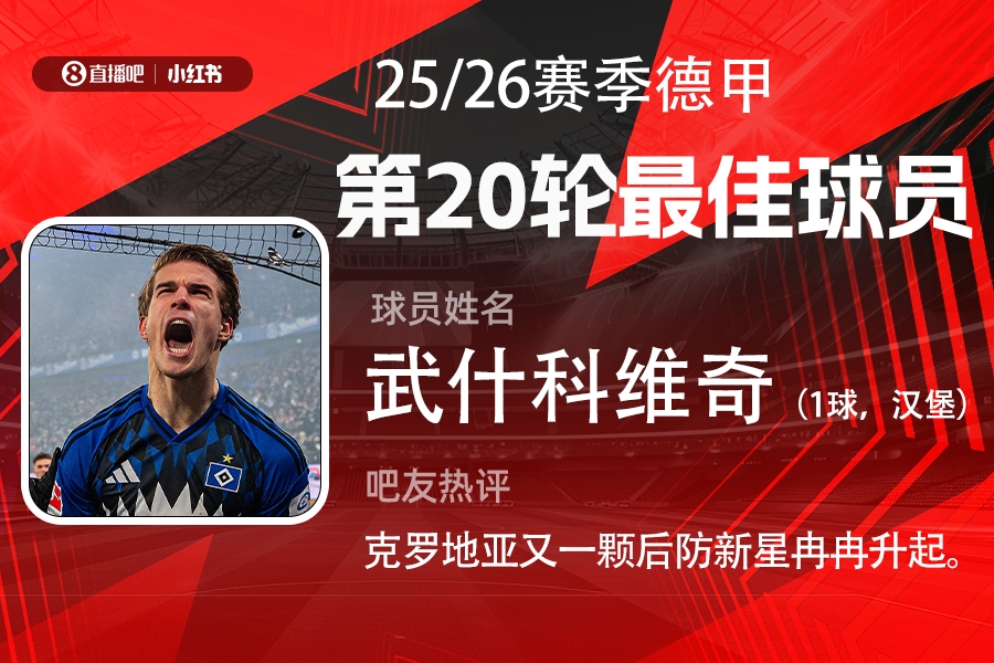 第20轮评选结果出炉,18岁热刺外租小将武什科维奇破门,攻防两端发挥俱佳,帮助汉堡逼平拜仁。武什科维奇当选[直播吧X小红书德甲第20轮最佳球员]!