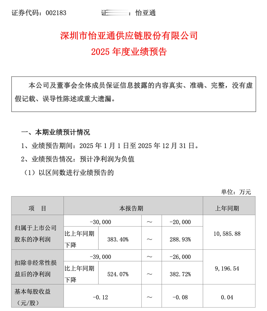 怡亚通这家国内供应链第一股,正迎来其发展历程中的关键时刻。2026年1月30日,怡亚通披露的2025年度业绩预告显示,预计全年归属于上市公司股东的净利润为亏损2亿元至3亿元,同比骤降288.93%~383.40%。
